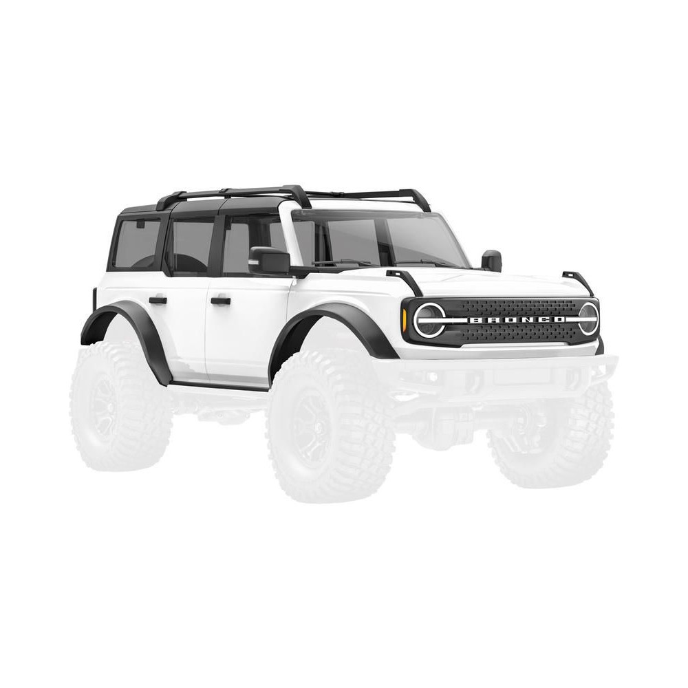 Traxxas karosszéria Ford Bronco 2021 fehér, TRX-4M RC modellautóhoz. 1:18 méretarányú ABS karosszéria, komplett, beleértve az átlátszó ablakokat, a pótkerék műpótkereket, a sárvédők szegélyeit, az oldalsó tükröket és egyéb részleteket.