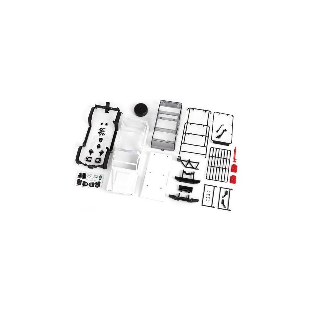 Traxxas Land Rover Defender karosszéria, festetlen fehér, komplett (összeszereletlen), TRX-4M RC autó modellhez. Szponzorálatlan, 1:18 méretarányú karosszéria ABS-ből, beleértve az átlátszó ablakokat, a pótkerék dummyját, a kannákat, a heverőt, a sárvédők szegélyeit, az oldalsó tükröket és egyéb részleteket.