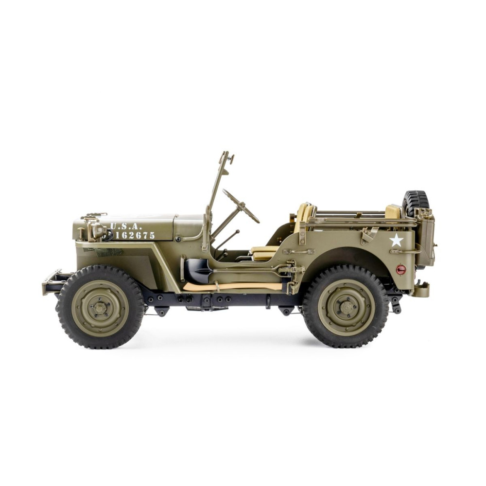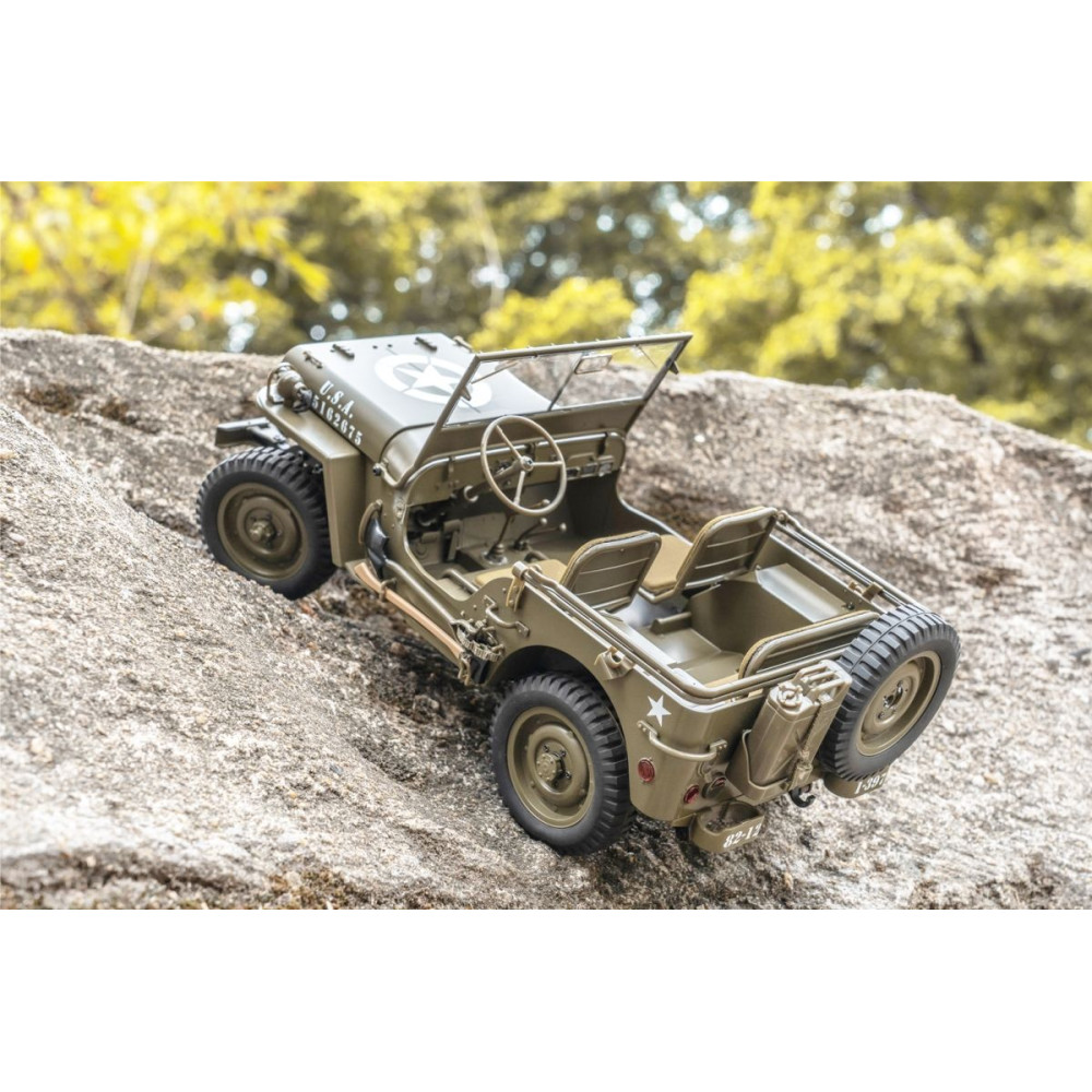 Az 1:12 1941 Willys MB Jeep sok mindent kínál, például élethűnek tűnő vászonüléseket, összecsukható hátsó padot nyitható tárolórekeszekkel, vagy valósághű futófelületi mintázatú gumiabroncsokat. A Willys MB alváza merev létravázzal rendelkezik, amely hűen követi teljes méretű megfelelőjét, többlapos rugókkal, lengéscsillapítókkal és differenciálművekkel, így ez a modell nagyszerű hasonmása a legendás történelmi Willysnek. A Willys MB fantasztikus LED-rendszerrel (négy irányjelző, két fényszóró és egy elsötétítő lámpa) van felszerelve, hogy segítsen felfedezni az éjszaka sötétjét. A méretarány és a részletesség beállítása mellett a 2,4 GHz-es ANT jeladója lehetővé teszi a modellezők számára a kezdőtől a szakértőig, hogy két vezérlési lehetőséggel (kúszómód és kezdő üzemmód), valamint az alacsony akkumulátor- és motortúlterhelésre vonatkozó figyelmeztetésekkel izgalmas utazást élvezhessenek.