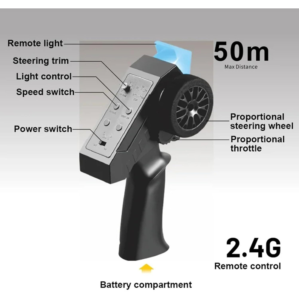 - Vezérlés: A 2,4 GHz-es négycsatornás távirányító stabil kapcsolatot és precíz vezérlést biztosít akár 50-100 méteres távolságból.