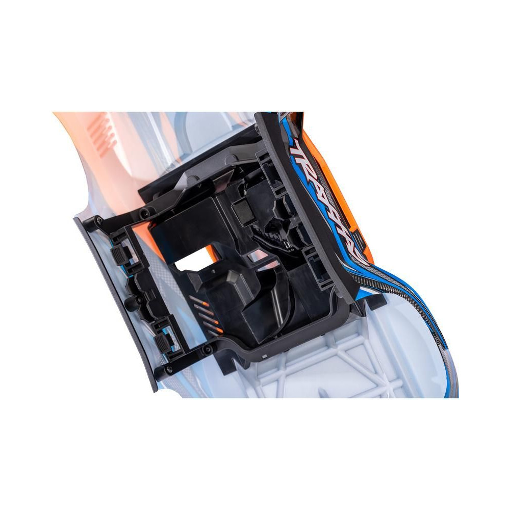 Az innovatív, kapocsmentes felépítmény-rögzítő rendszer tartós, belső megerősítésekkel rendelkezik, és könnyen használható. Csak helyezze a felépítményt az alvázra, és pattintsa a helyére. Amikor eljön az ideje...Az akkumulátor cseréjéhez nyomd meg a reteszeket az alvázon, és emeld fel, hogy másodpercek alatt bejuthass a modellbe.