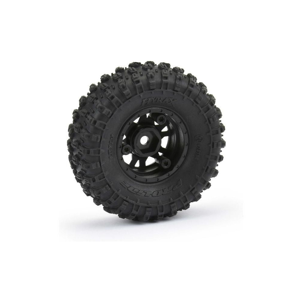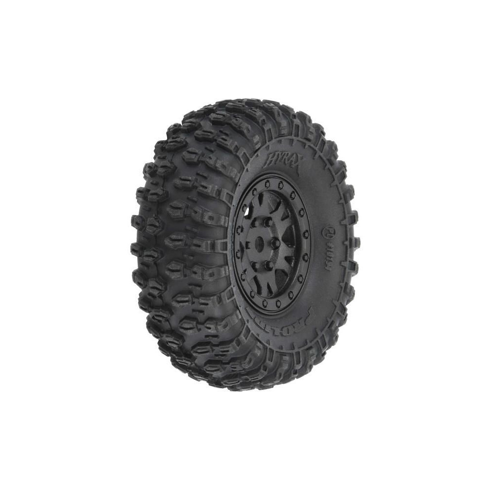 Pro-Line komplett kerekek RC autó modellekhez 1:24 (SCX24. Méret ⌀53x19 mm. Impulzus tárcsa fekete színű. Gumiabroncsok Hyrax 1.0", keverék keménysége Medium. A hordozó hatszögletű 7 mm.