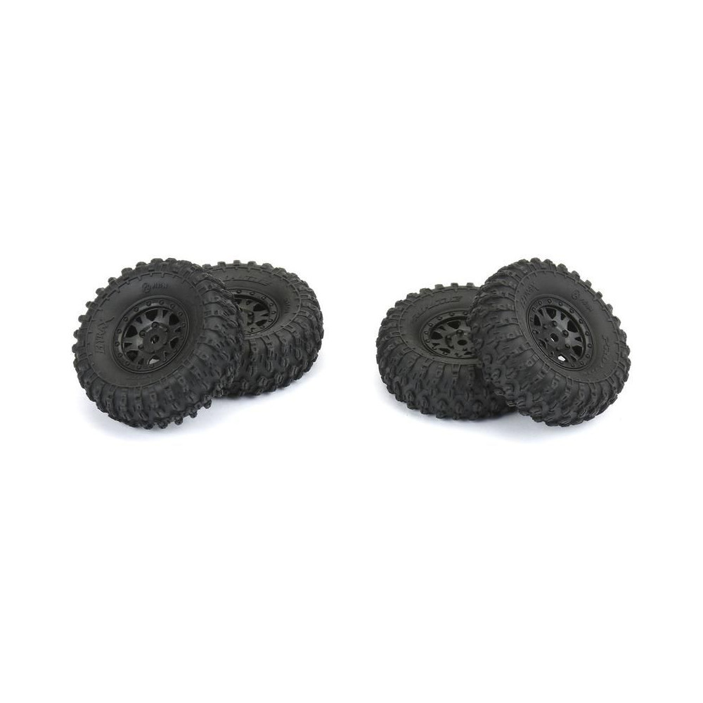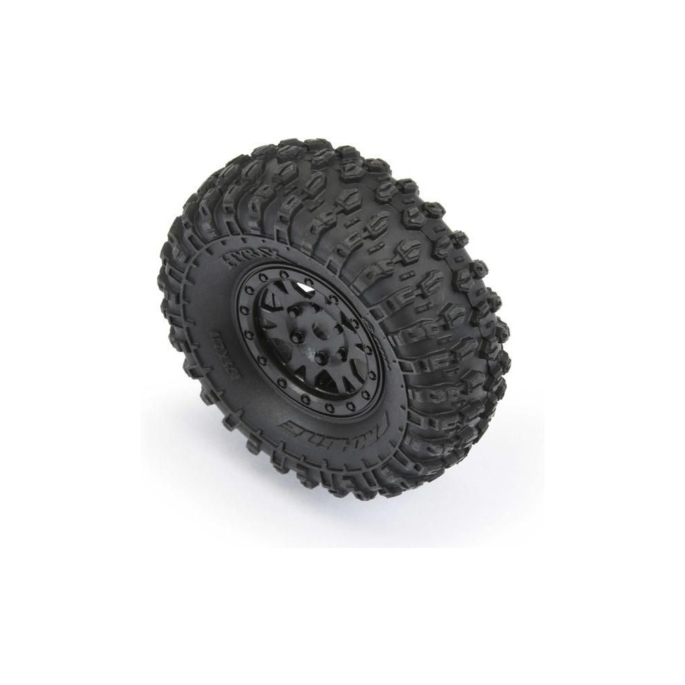 Pro-Line komplett kerekek RC autó modellekhez 1:24 (SCX24). Méret ⌀53x19 mm. Impulzus tárcsa fekete színű. Gumiabroncsok Hyrax 1.0", keverék keménysége Medium. A hordozó hatszögletű 7 mm.