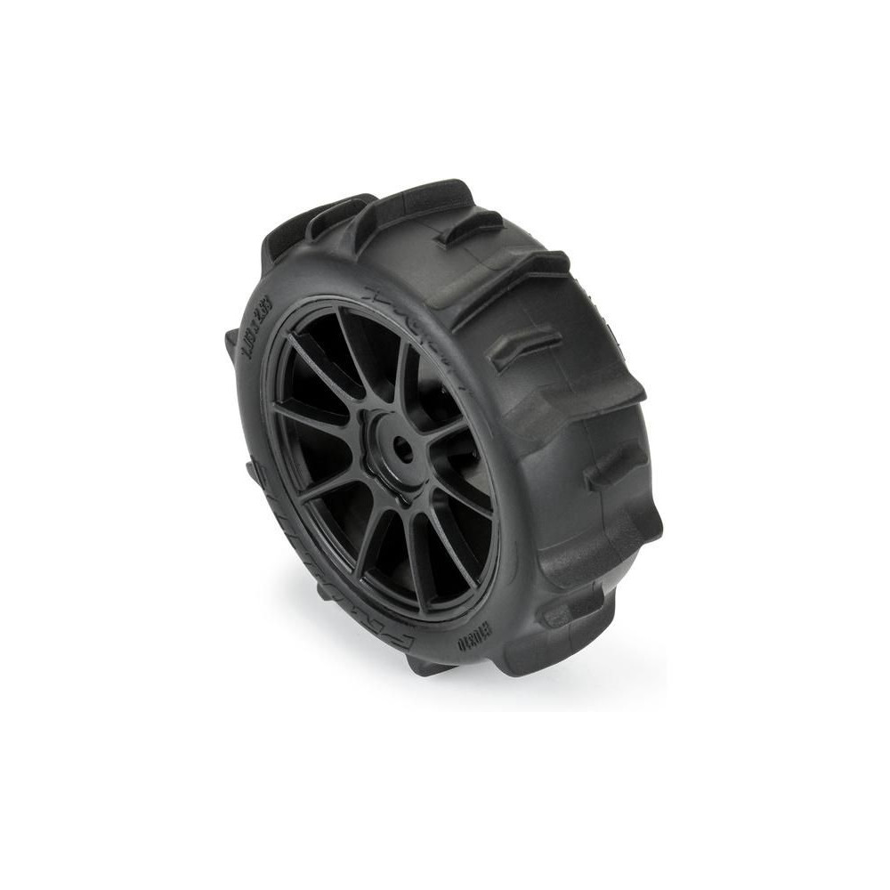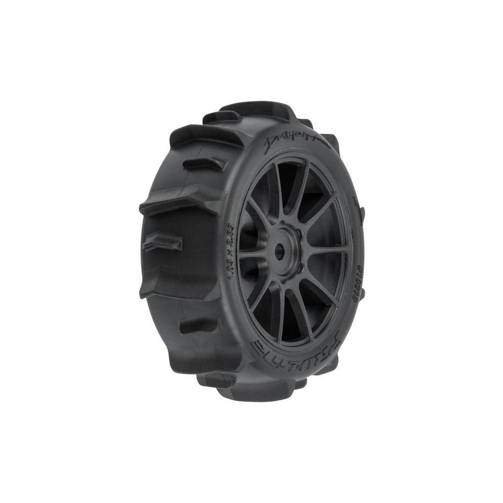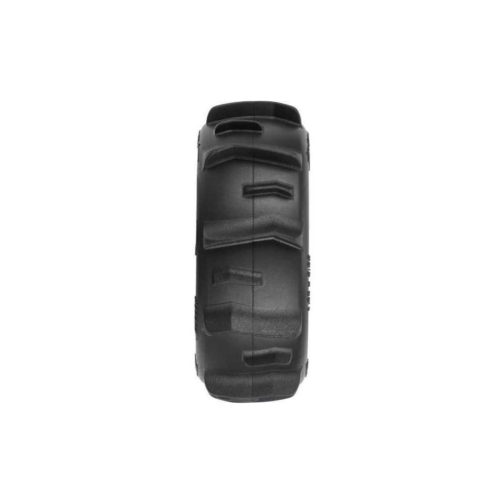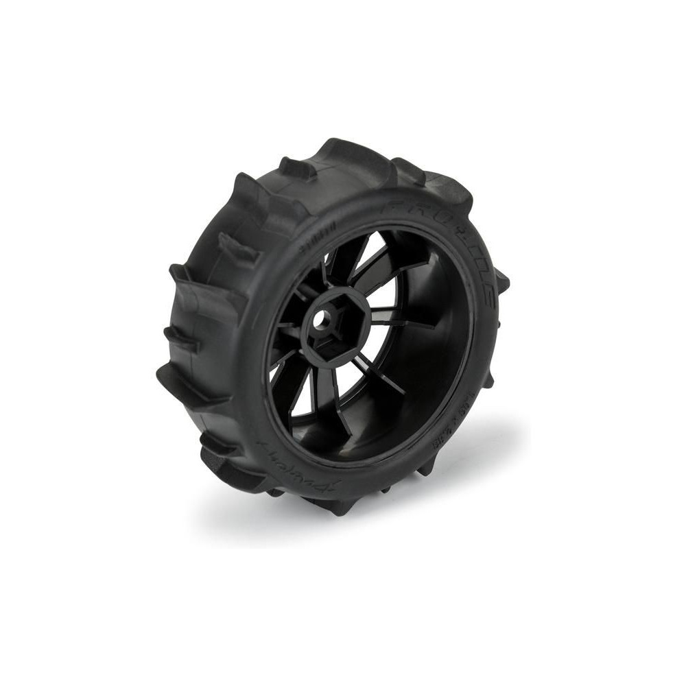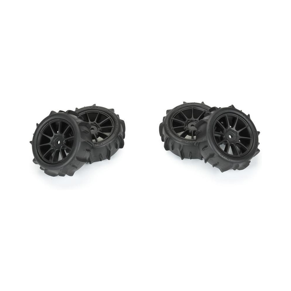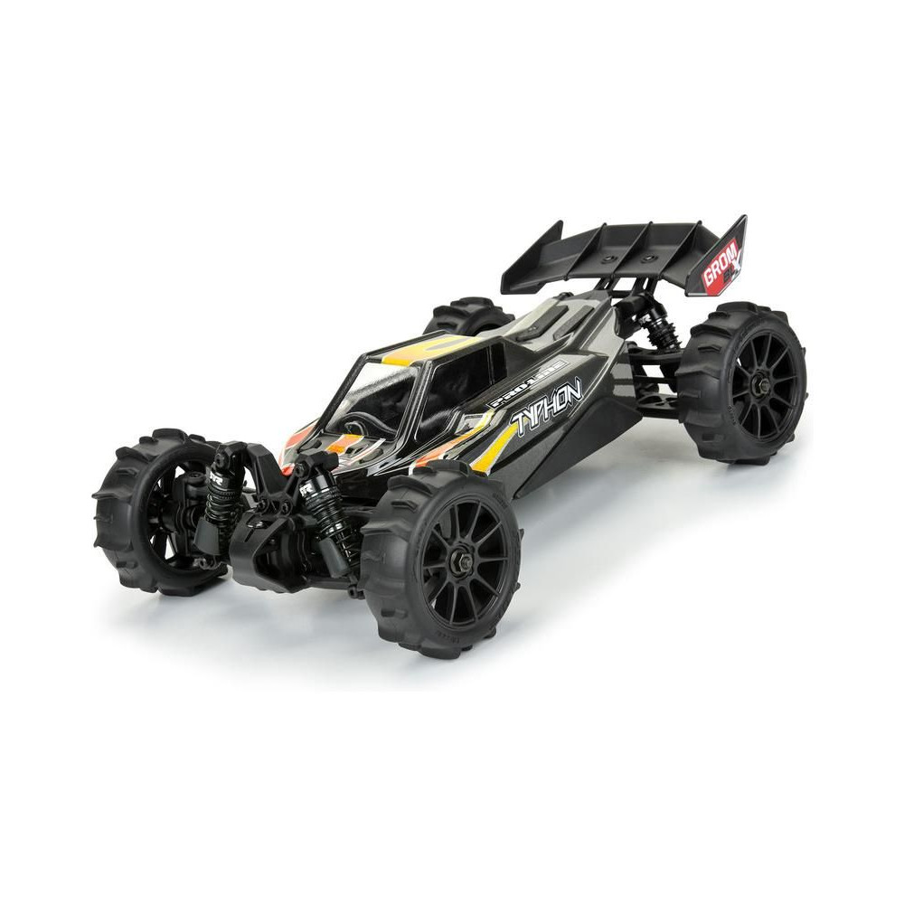 Komplett Pro-Line kerekek RC autómodellekhez 1:14 Typhon GROM. Méretek ⌀72x26 mm. A Mach-10 korong fekete. Dumont evezőgumik 1,9". A csomagtartó egy 12 mm-es hatszögletű gumi. Nyitott cellás betét.