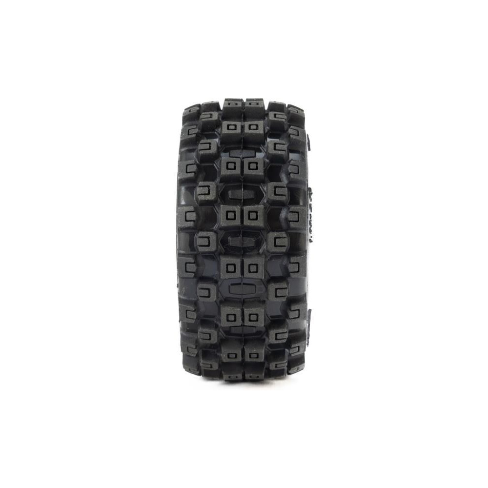 A Badlands MX gumiabroncsok a Pro-Line által valaha kiadott legagresszívabb miniatűr futófelülettel rendelkeznek, amely hihetetlen tapadást biztosít füvön, földön és homokon, miközben kiszámítható kezelhetőséget biztosít. Az irányítatlan mintázat kiszámítható tapadást biztosít a kanyarokban, ugyanakkor lehetővé teszi az abroncsok forgatását a hosszabb élettartam érdekében. Mivel az abroncsok már ragasztva vannak, a felszerelés gyors és gondtalan.