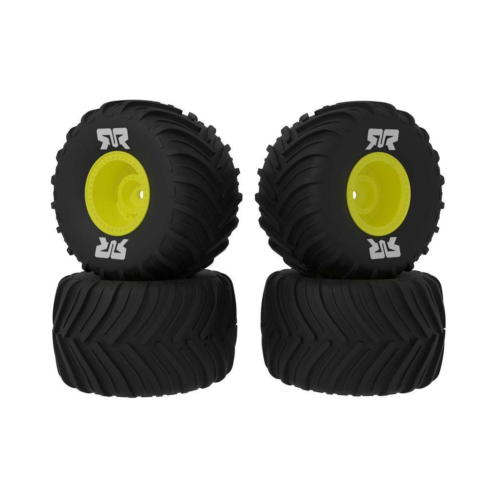 Alkatrész Arrma Grom RC autómodellekhez: dBoots Chevron MT gumiabroncsokkal szerelt kerék, sárga tárcsa (4).