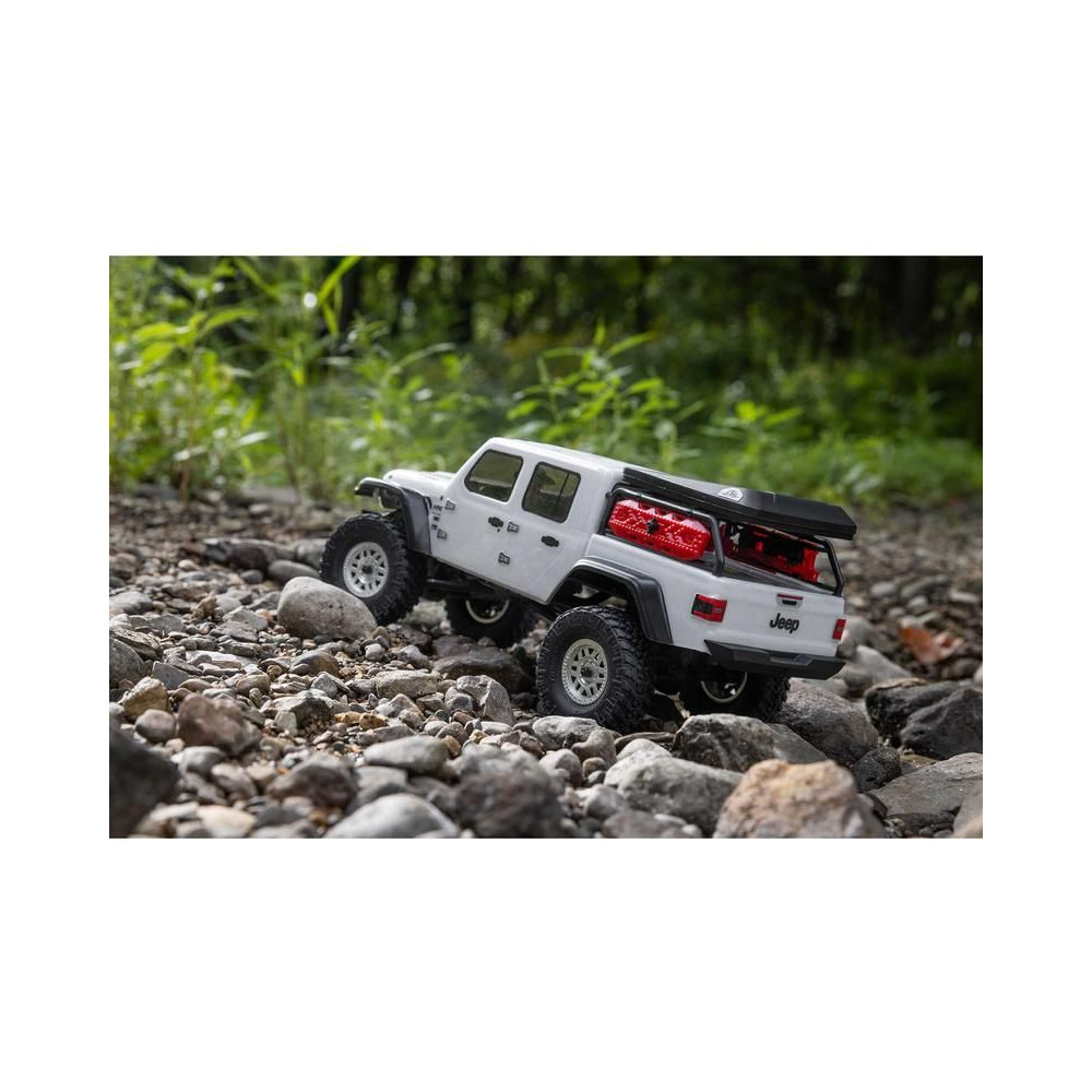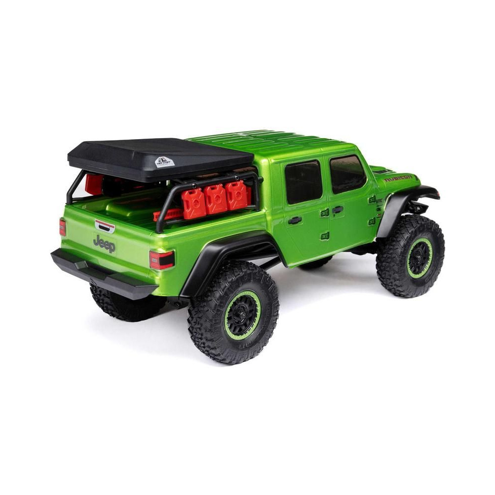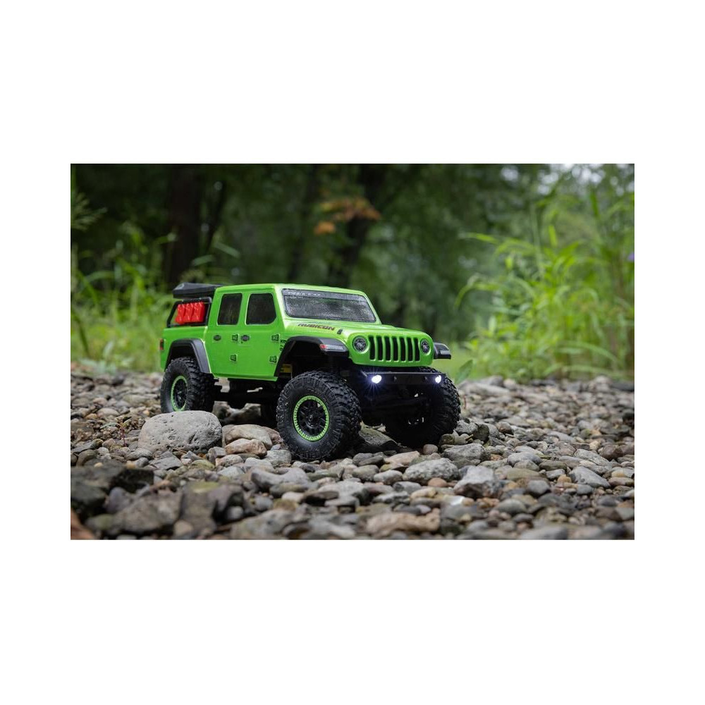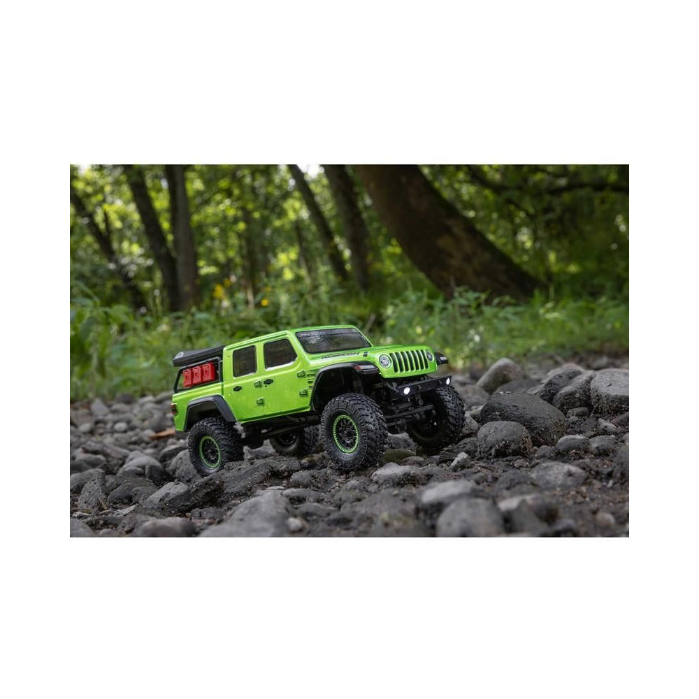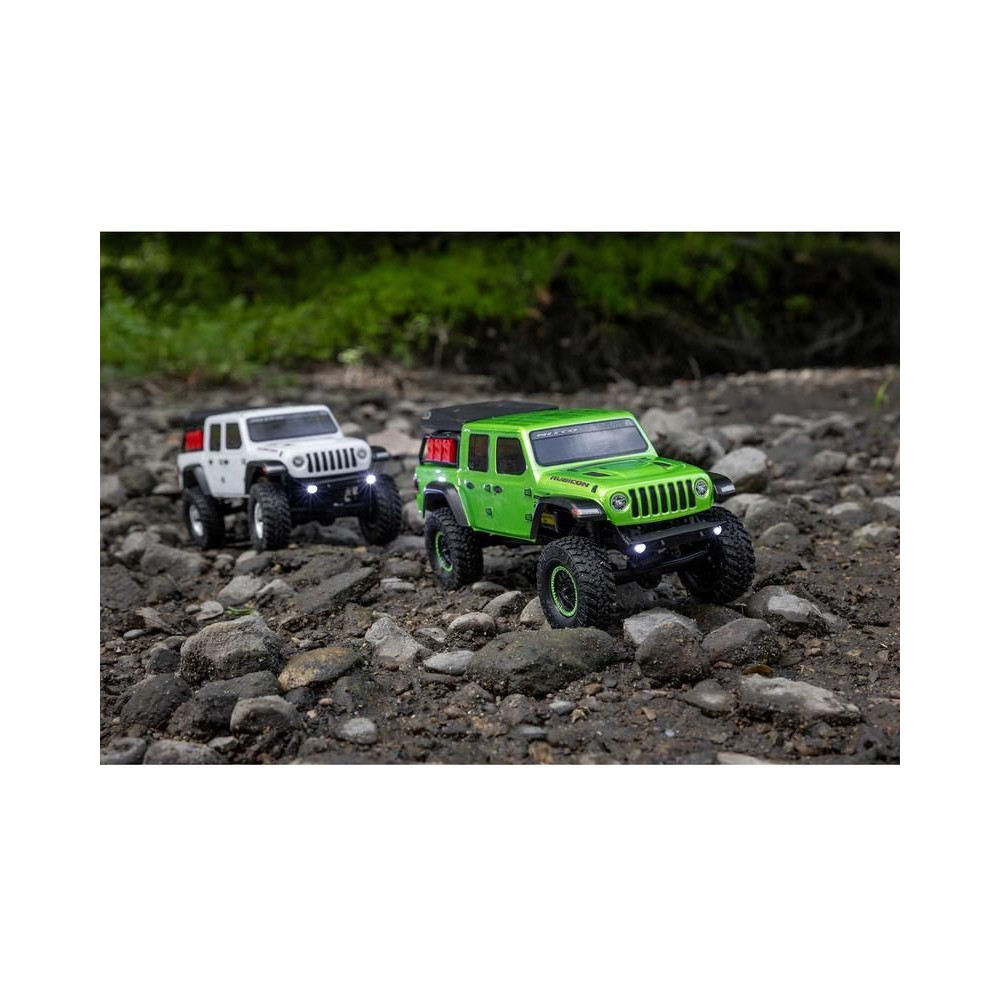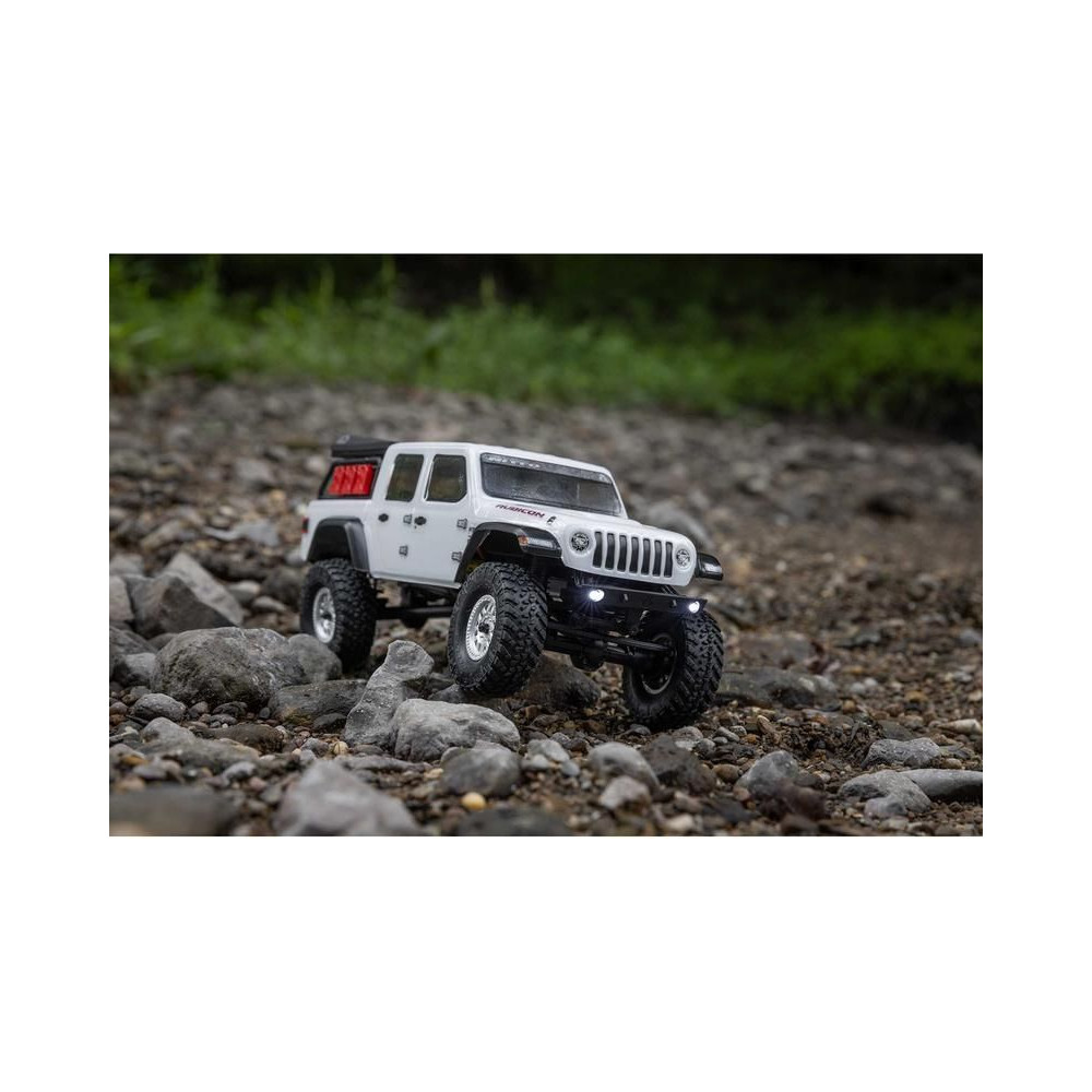 1:24 méretarányú RC modell autó Axial SCX24 Jeep JT Gladiator V2 karosszériával és LED világítással az első lökhárítóban. A csomagban minden megtalálható, amire szüksége van. A modell a bevált off-road egyedi SCX24 alváz mellett új vezérlőegységgel és Spektrum RC készlettel van felszerelve. A fejlesztéseket olajjal töltött lengéscsillapítók egészítik ki, amelyek simán elnyelik az ütéseket, és a modell terepen is stabil marad. A modell üzemideje akár 40 perc is lehet.