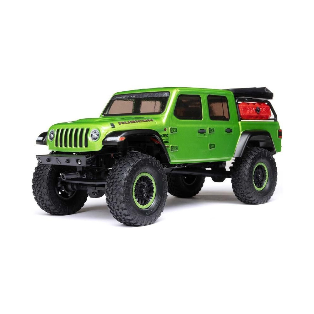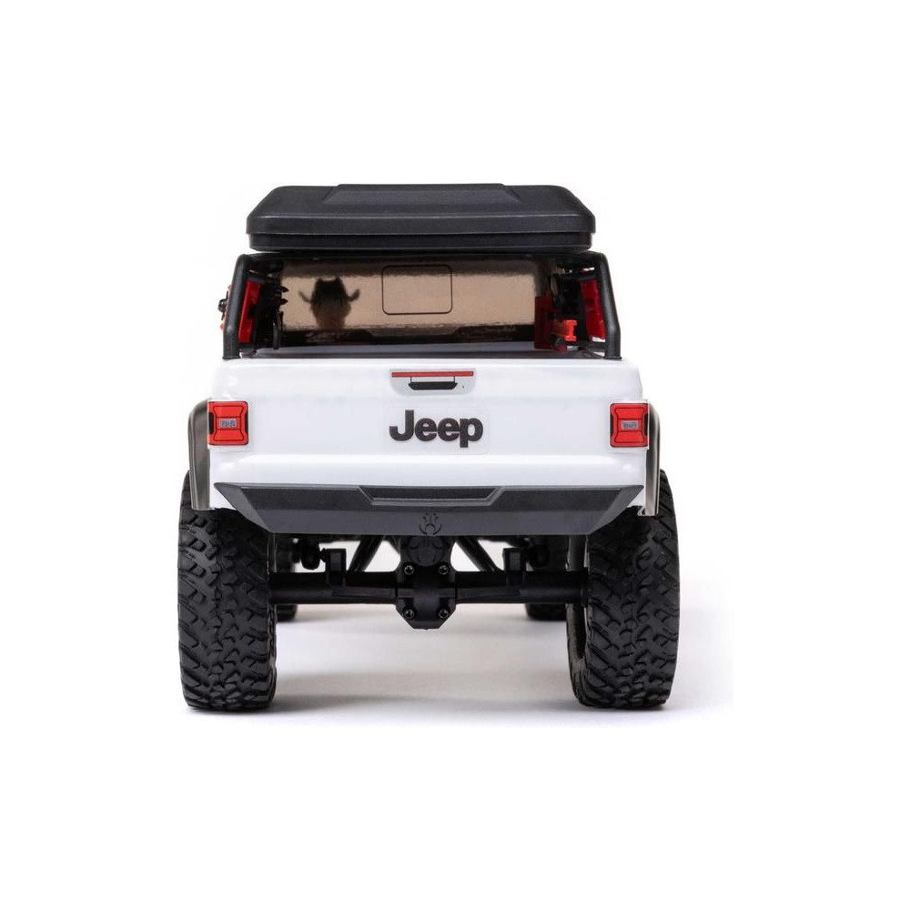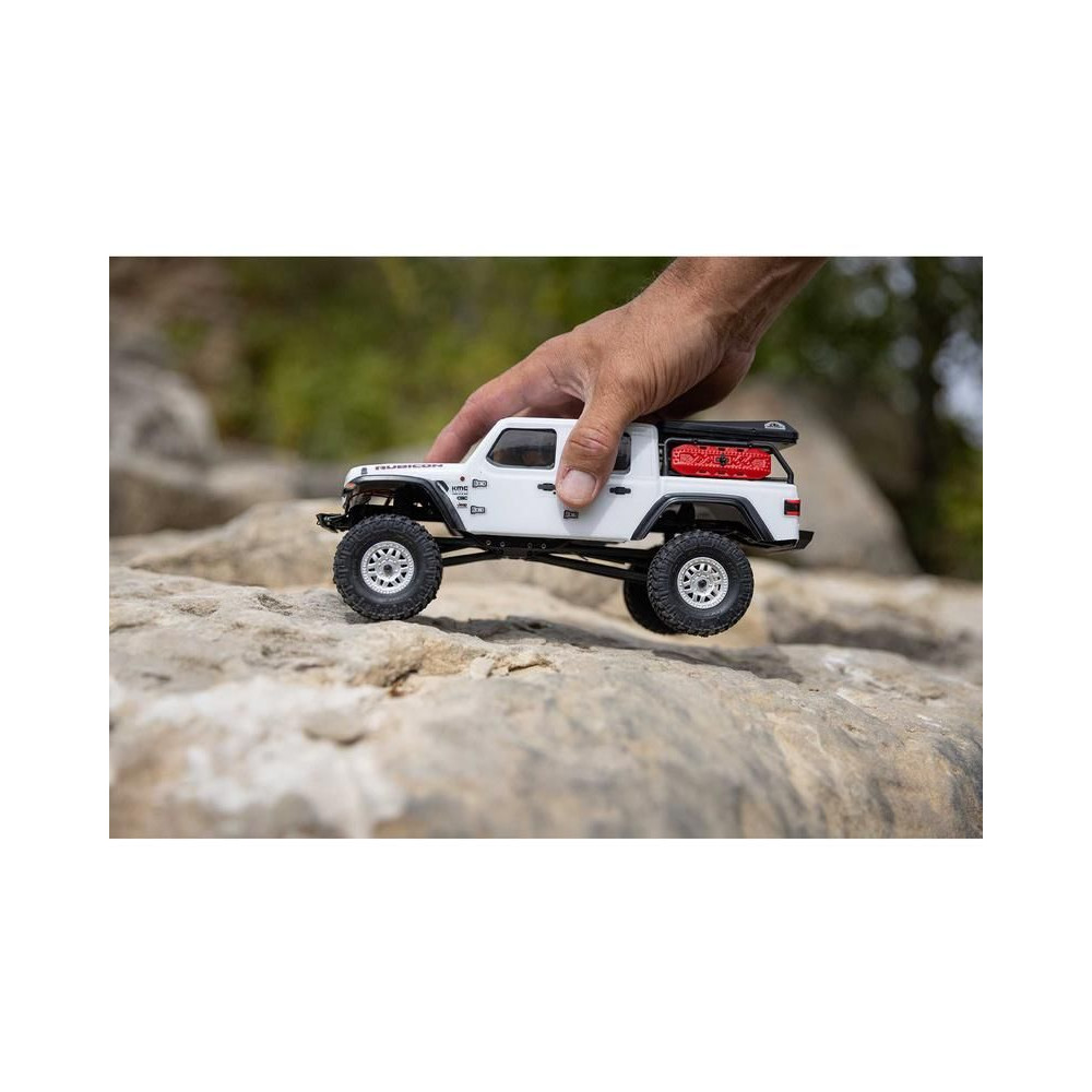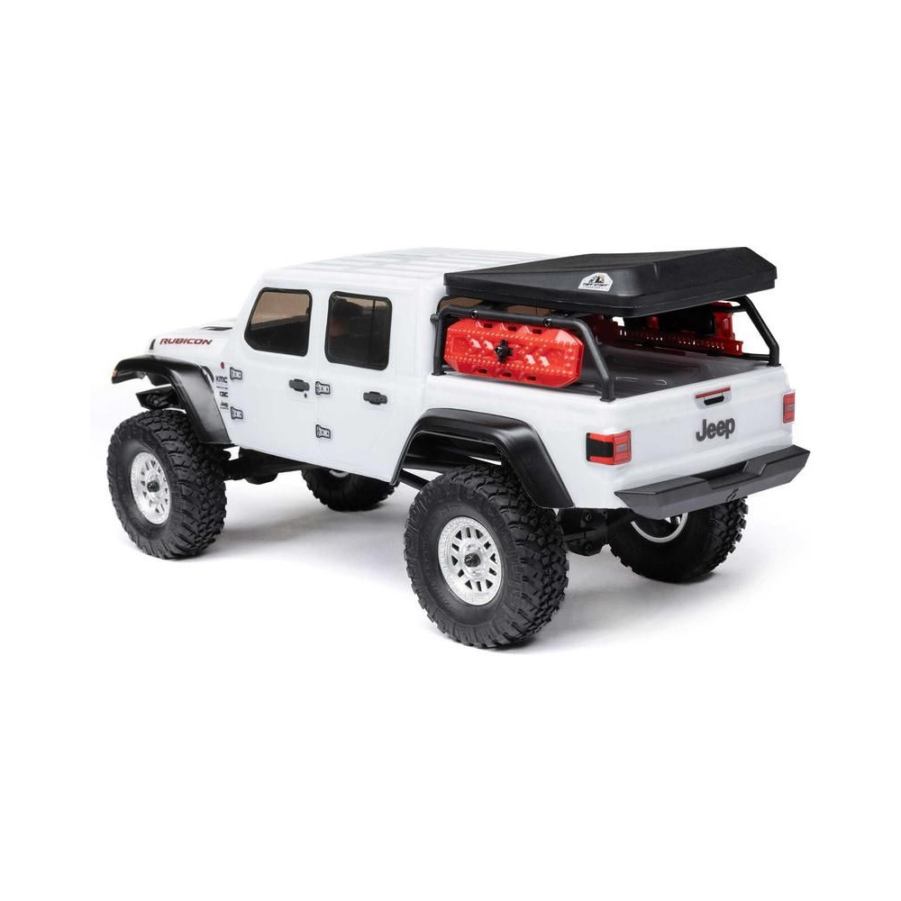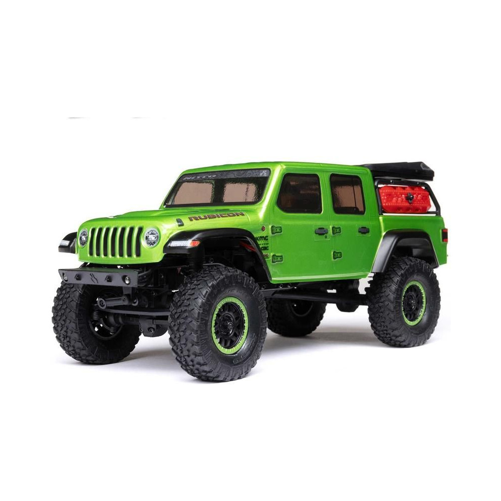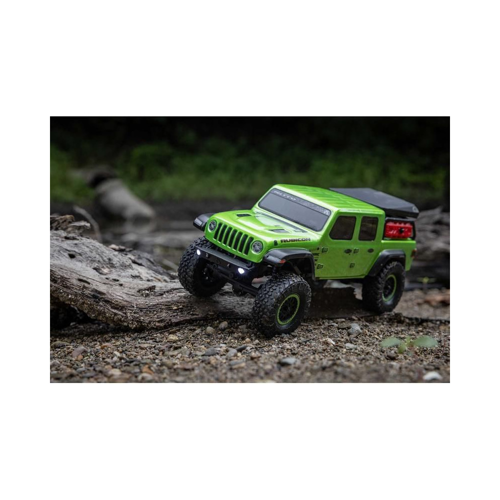 1:24 méretarányú RC modell autó Axial SCX24 Jeep JT Gladiator V2 karosszériával és LED világítással az első lökhárítóban. A csomagban minden megtalálható, amire szüksége van. A modell a bevált off-road egyedi SCX24 alváz mellett új vezérlőegységgel és Spektrum RC készlettel van felszerelve. A fejlesztéseket olajjal töltött lengéscsillapítók egészítik ki, amelyek simán elnyelik az ütéseket, és a modell terepen is stabil marad. A modell üzemideje akár 40 perc is lehet.