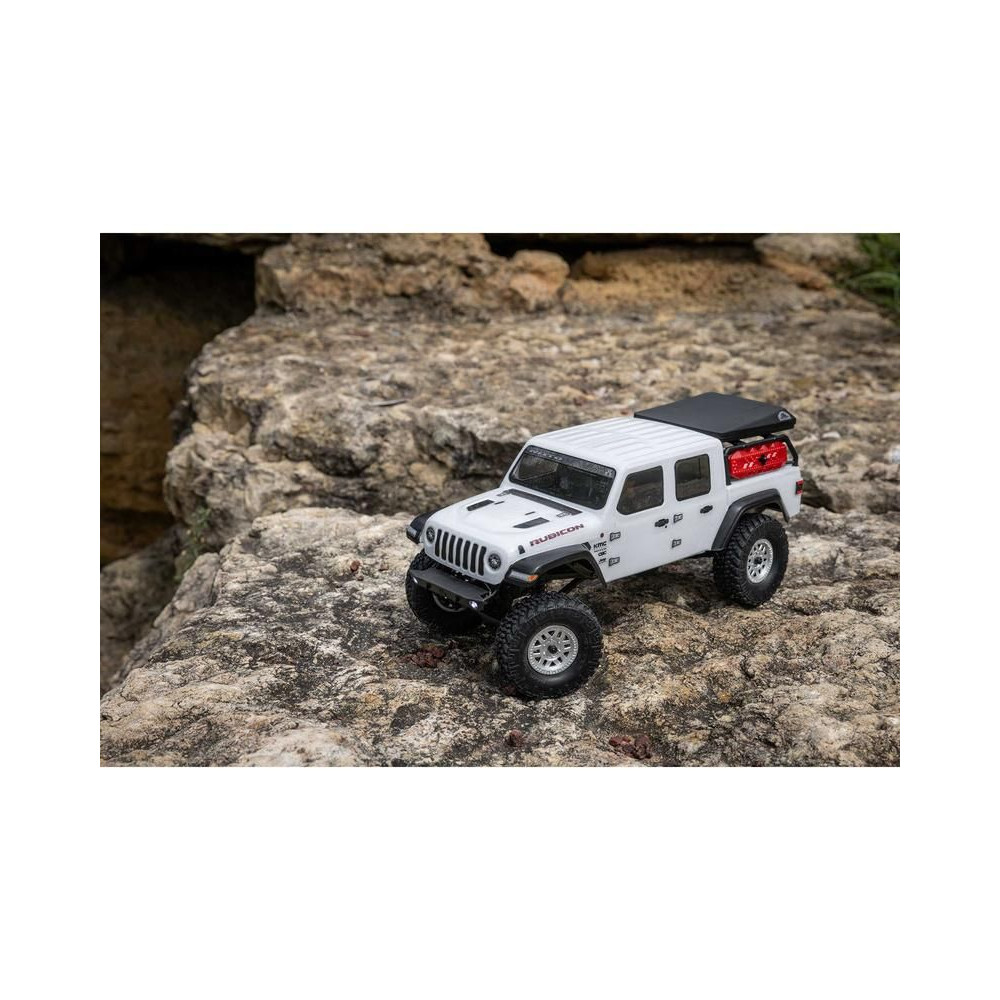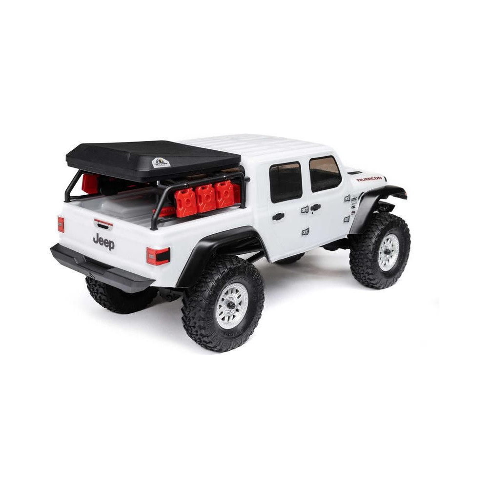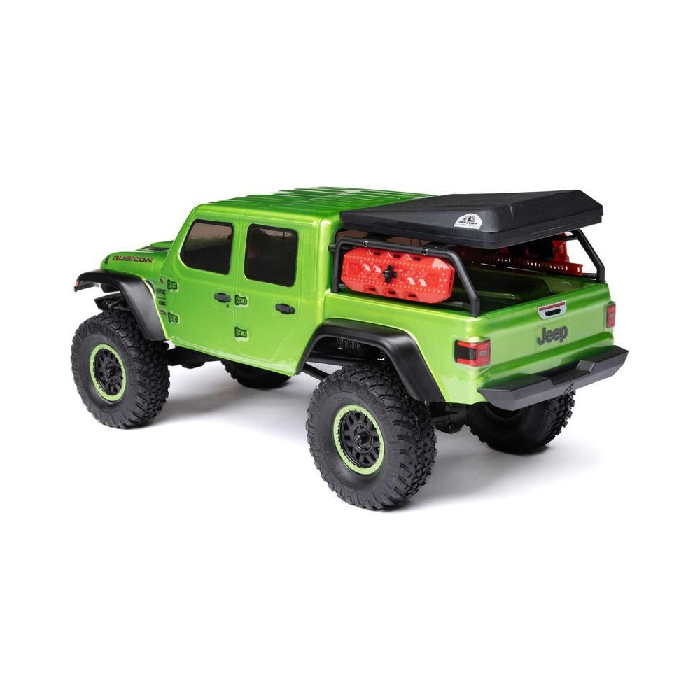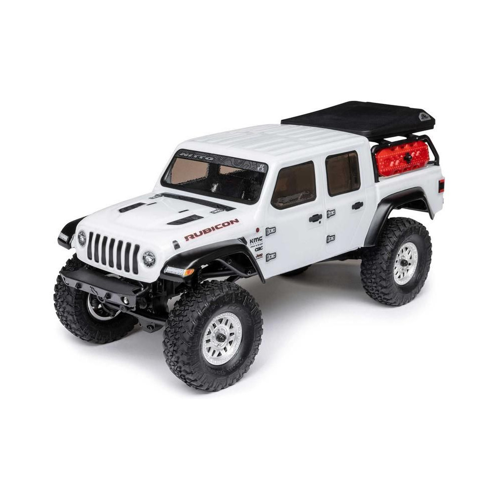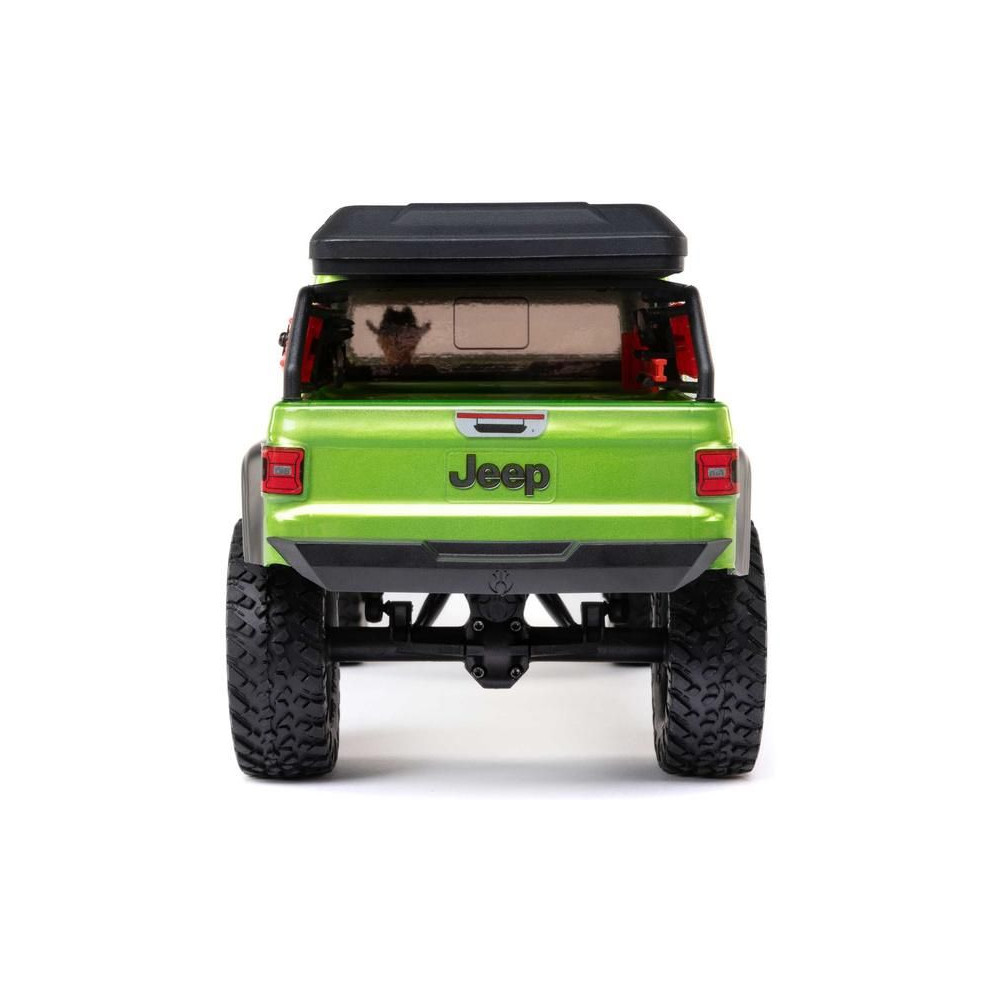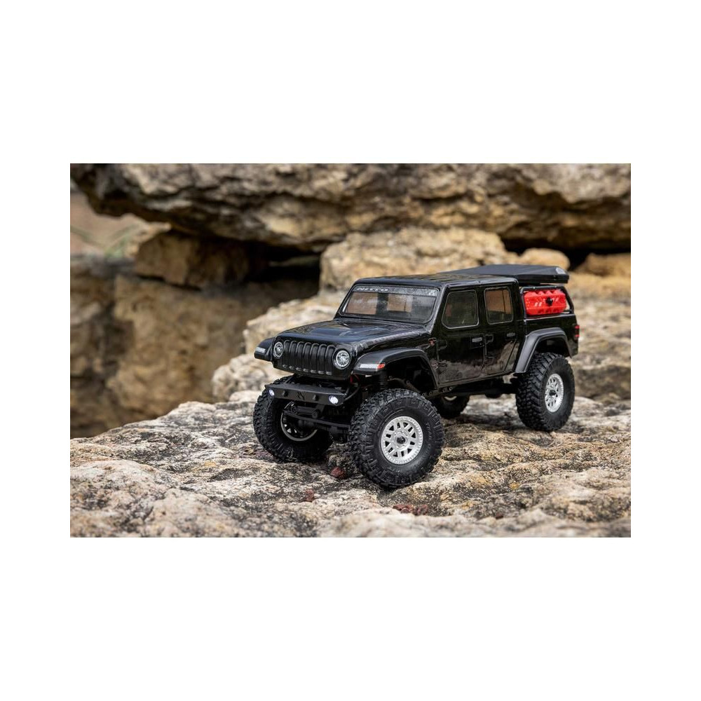 1:24 méretarányú RC modell autó Axial SCX24 Jeep JT Gladiator V2 karosszériával és LED világítással az első lökhárítóban. A csomagban minden megtalálható, amire szüksége van. A modell a bevált off-road egyedi SCX24 alváz mellett új vezérlőegységgel és Spektrum RC készlettel van felszerelve. A fejlesztéseket olajjal töltött lengéscsillapítók egészítik ki, amelyek simán elnyelik az ütéseket, és a modell terepen is stabil marad. A modell üzemideje akár 40 perc is lehet.