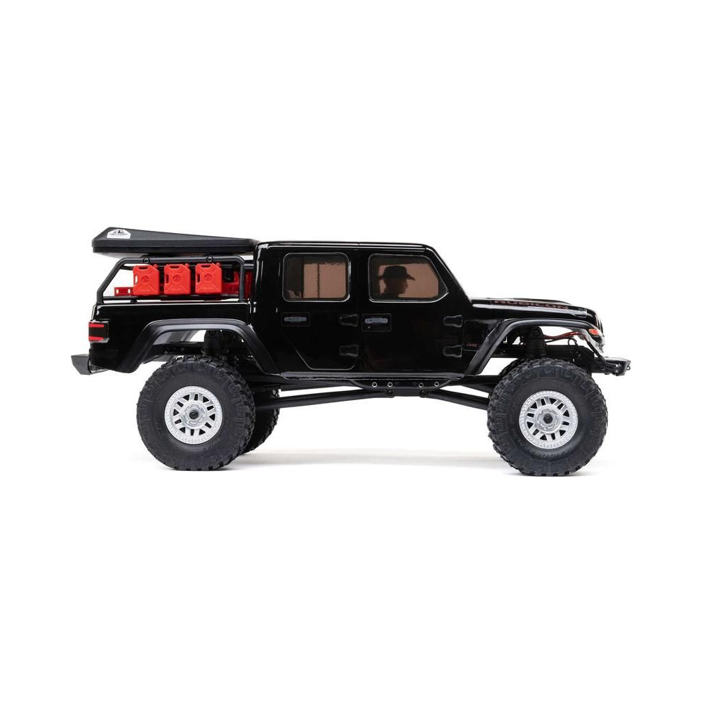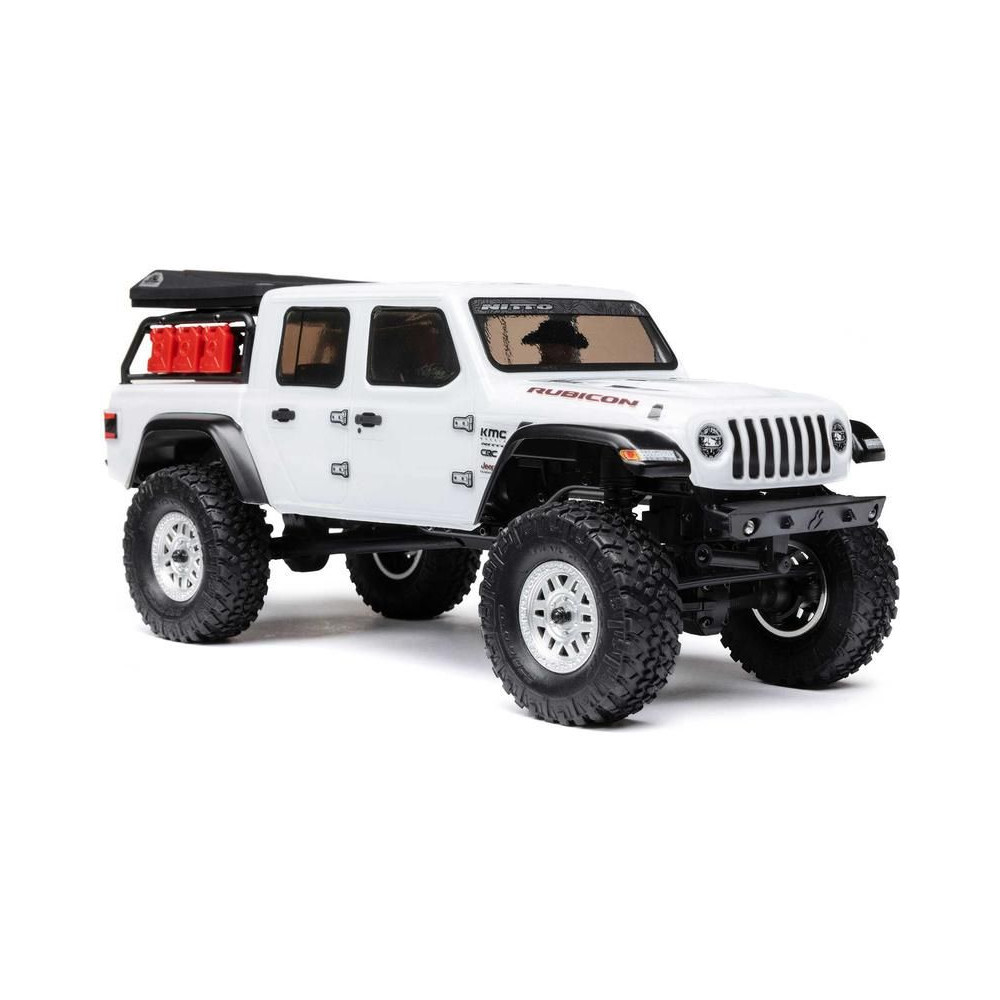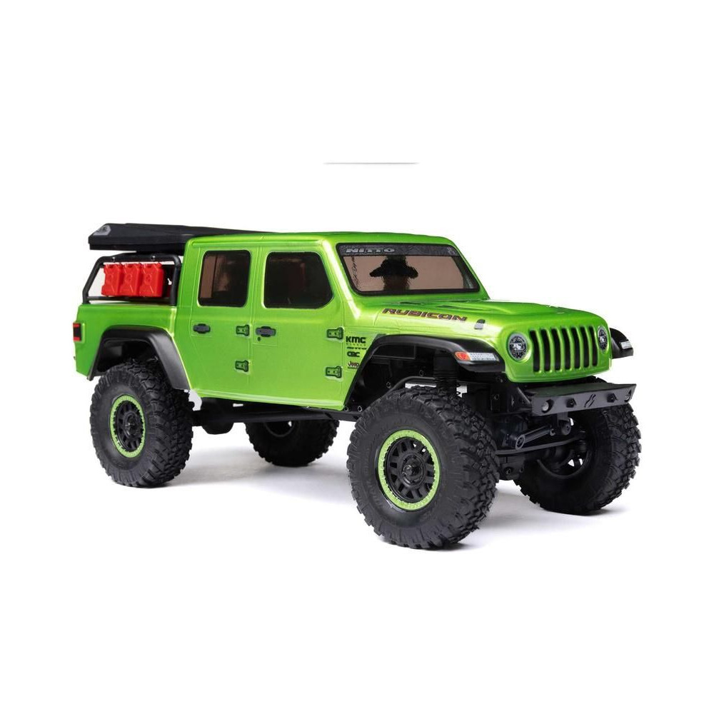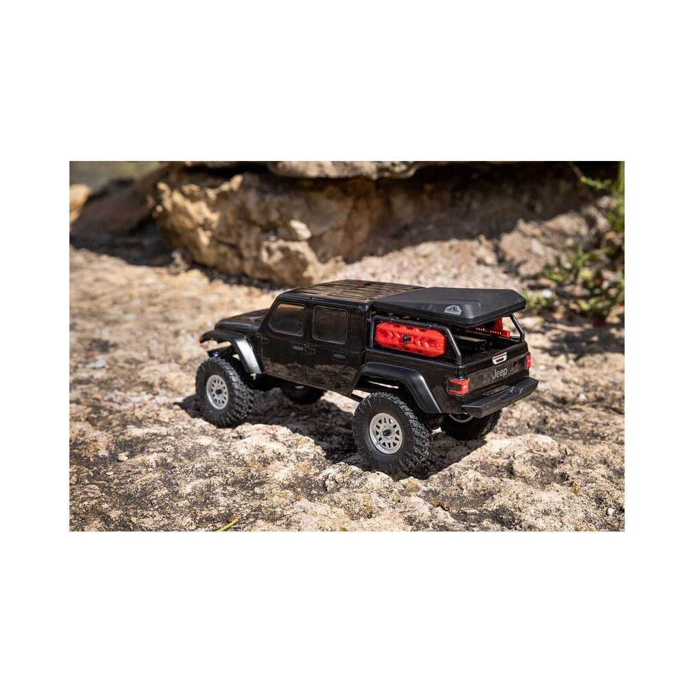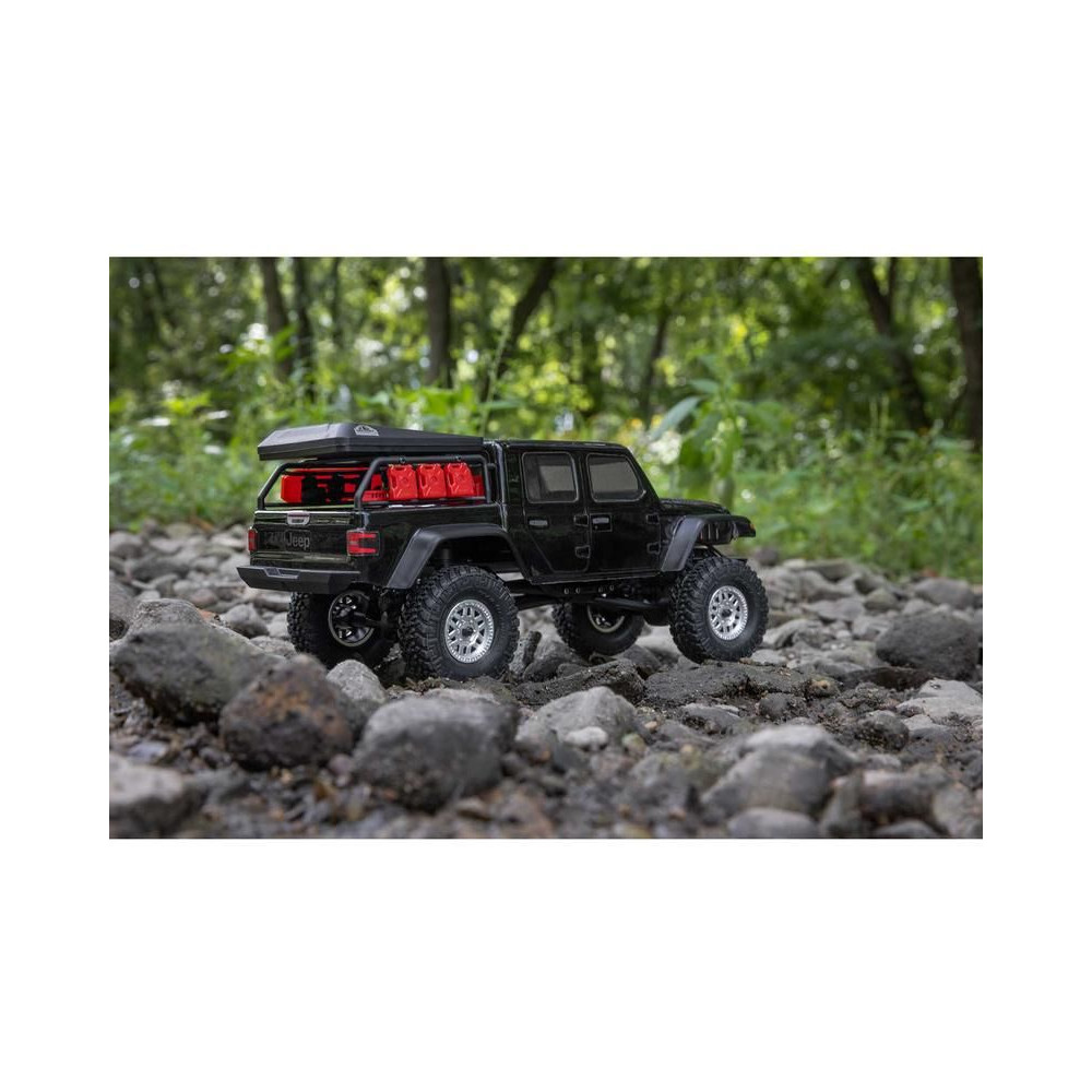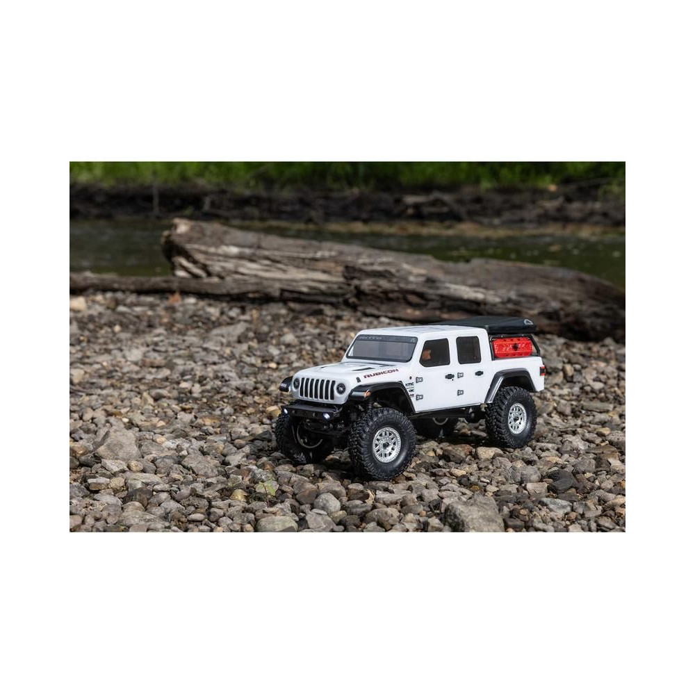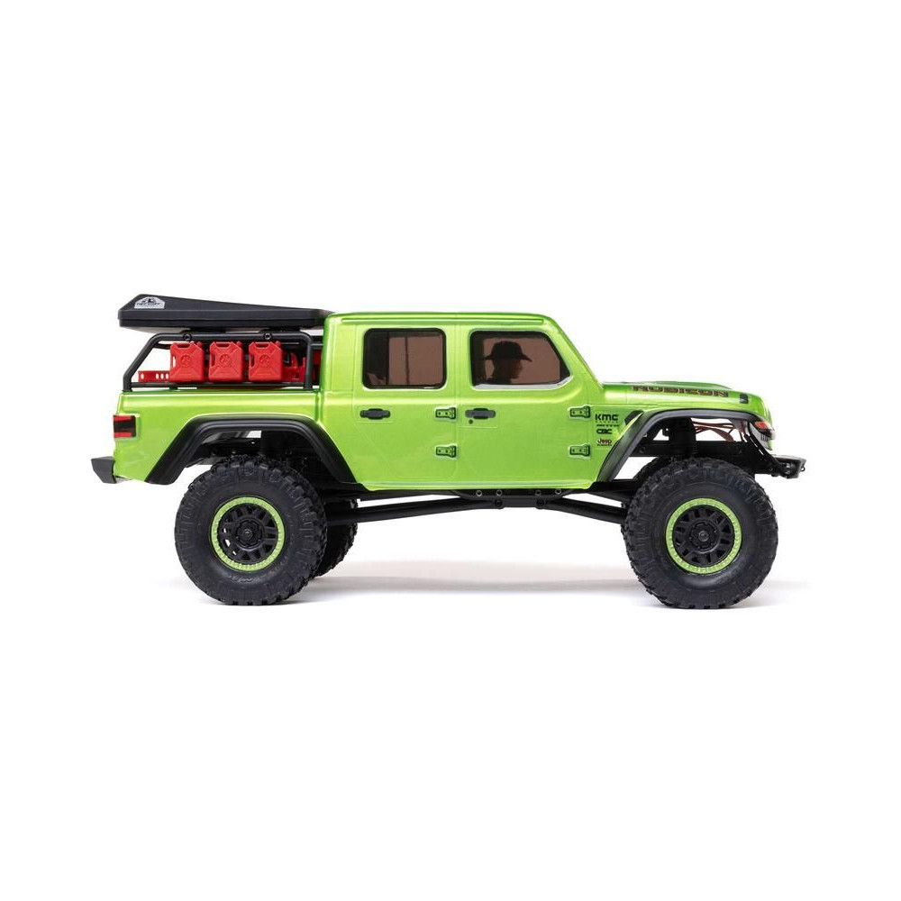 1:24 méretarányú RC modell autó Axial SCX24 Jeep JT Gladiator V2 karosszériával és LED világítással az első lökhárítóban. A csomagban minden megtalálható, amire szüksége van. A modell a bevált off-road egyedi SCX24 alváz mellett új vezérlőegységgel és Spektrum RC készlettel van felszerelve. A fejlesztéseket olajjal töltött lengéscsillapítók egészítik ki, amelyek simán elnyelik az ütéseket, és a modell terepen is stabil marad. A modell üzemideje akár 40 perc is lehet.