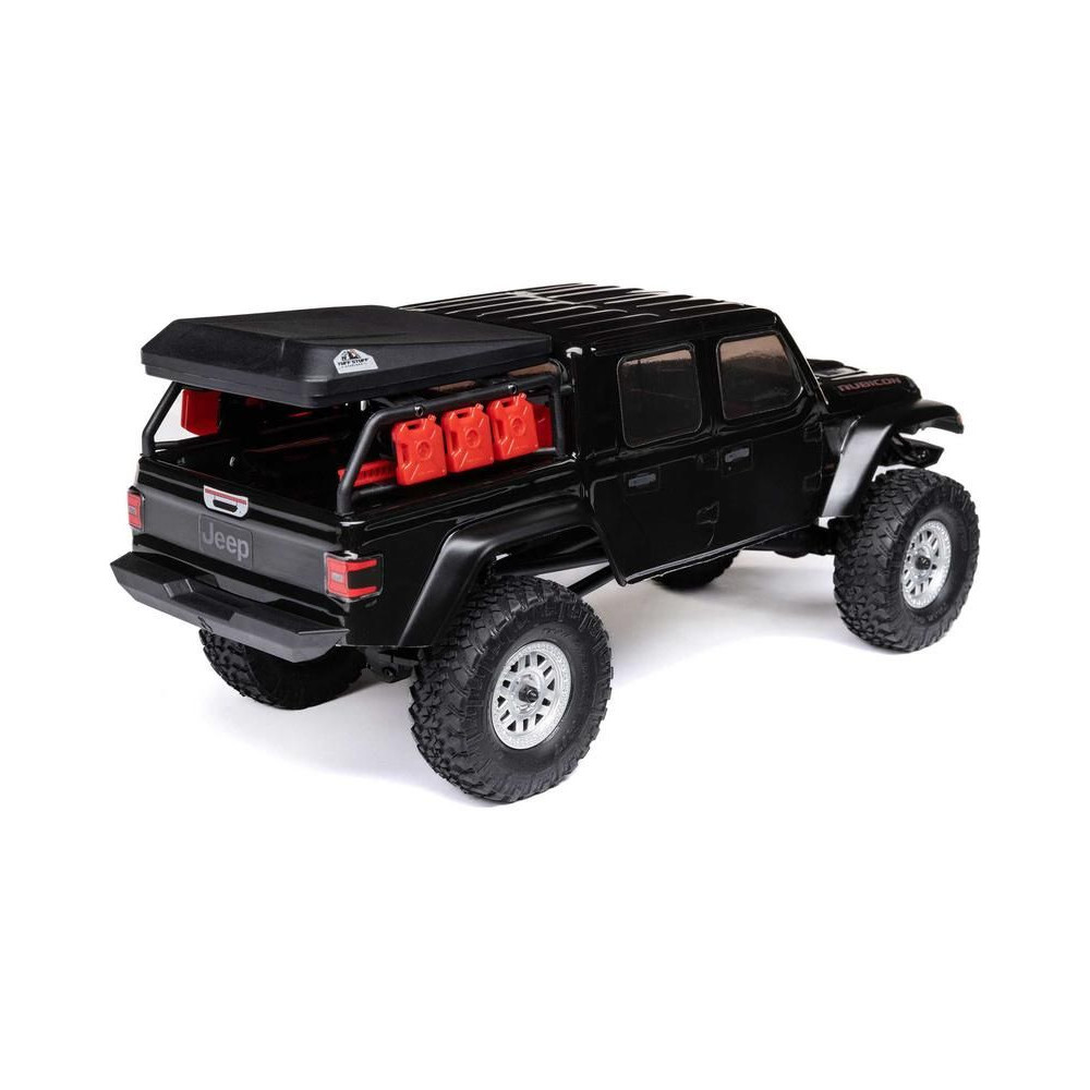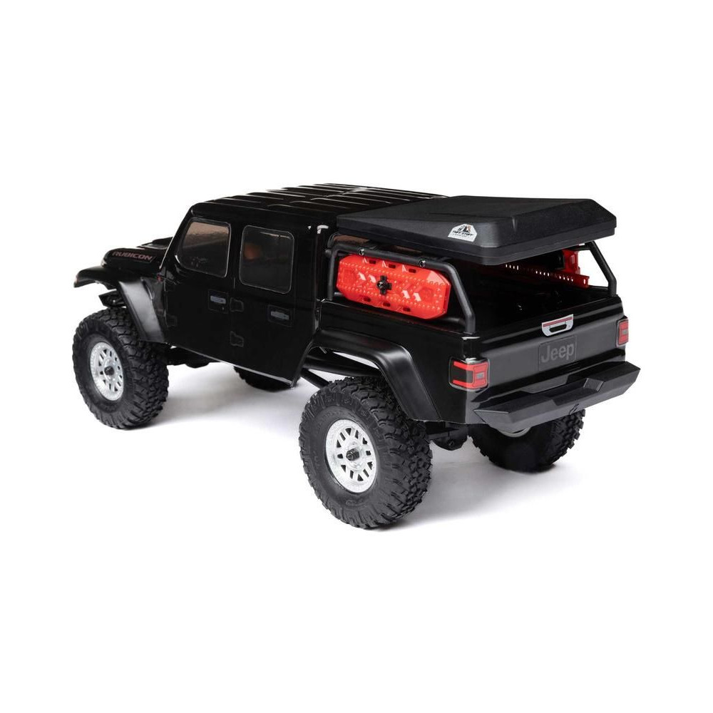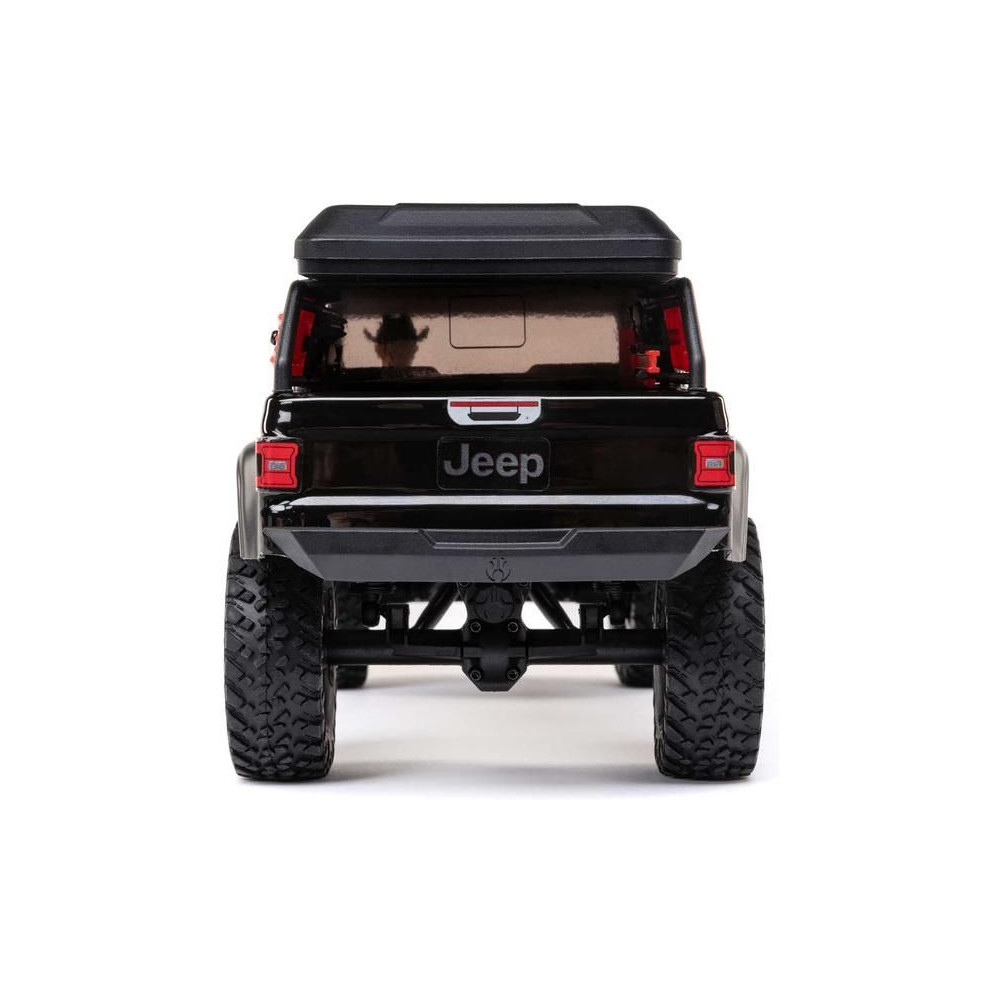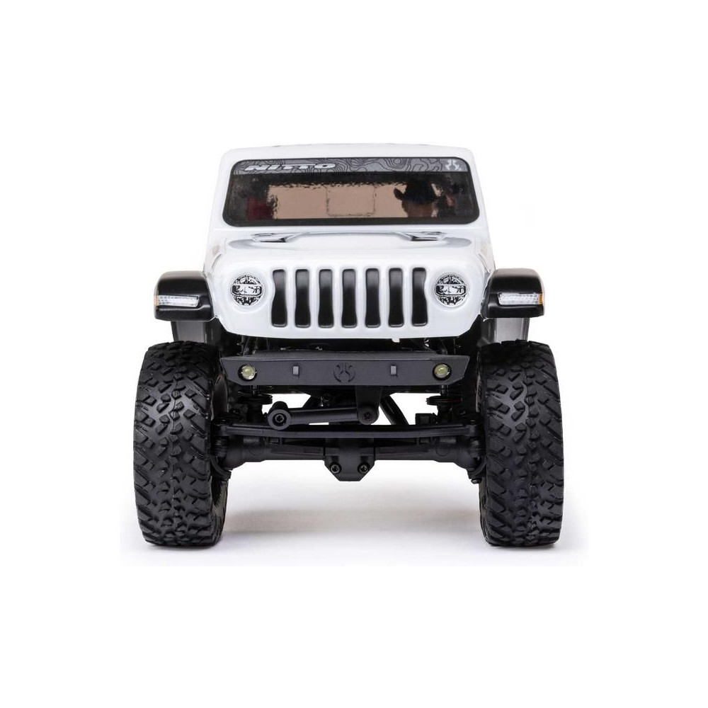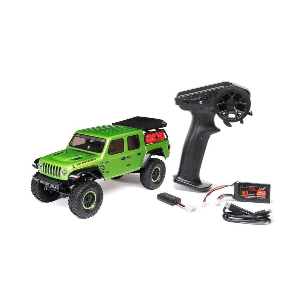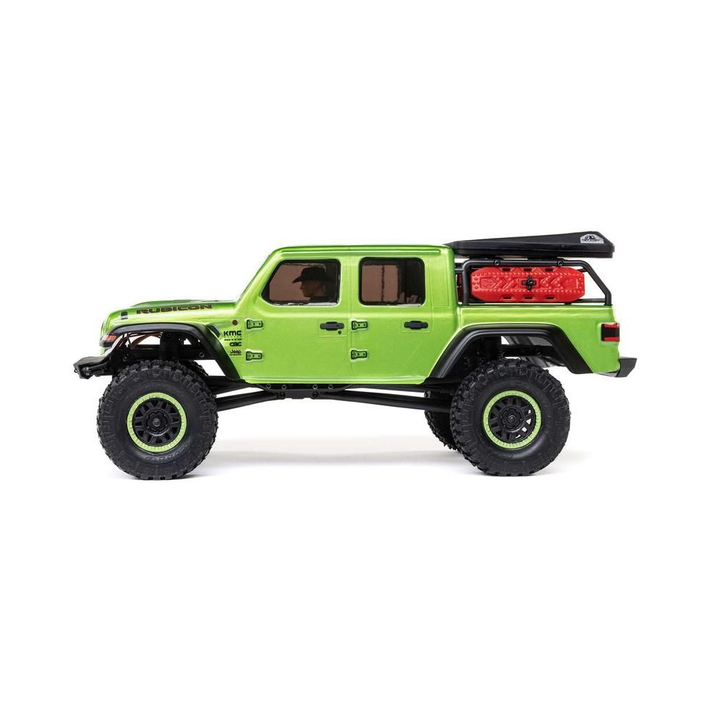 1:24 méretarányú RC modell autó Axial SCX24 Jeep JT Gladiator V2 karosszériával és LED világítással az első lökhárítóban. A csomagban minden megtalálható, amire szüksége van. A modell a bevált off-road egyedi SCX24 alváz mellett új vezérlőegységgel és Spektrum RC készlettel van felszerelve. A fejlesztéseket olajjal töltött lengéscsillapítók egészítik ki, amelyek simán elnyelik az ütéseket, és a modell terepen is stabil marad. A modell üzemideje akár 40 perc is lehet.