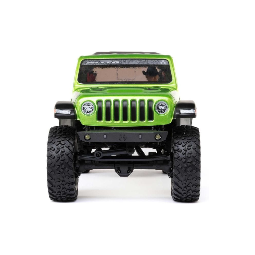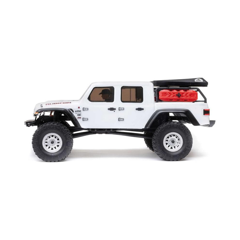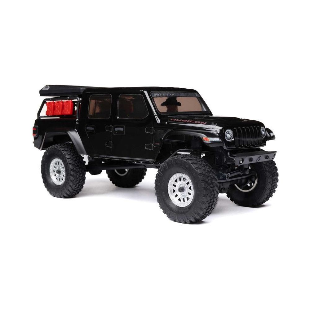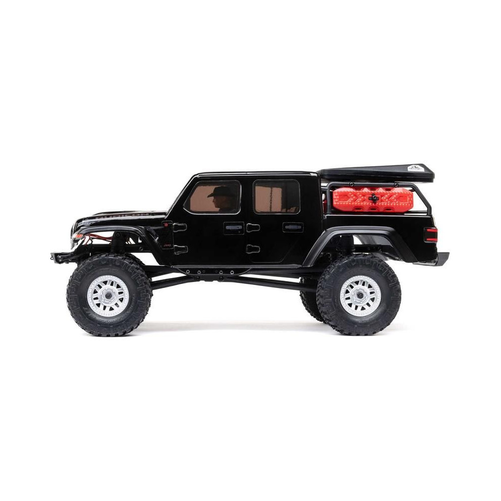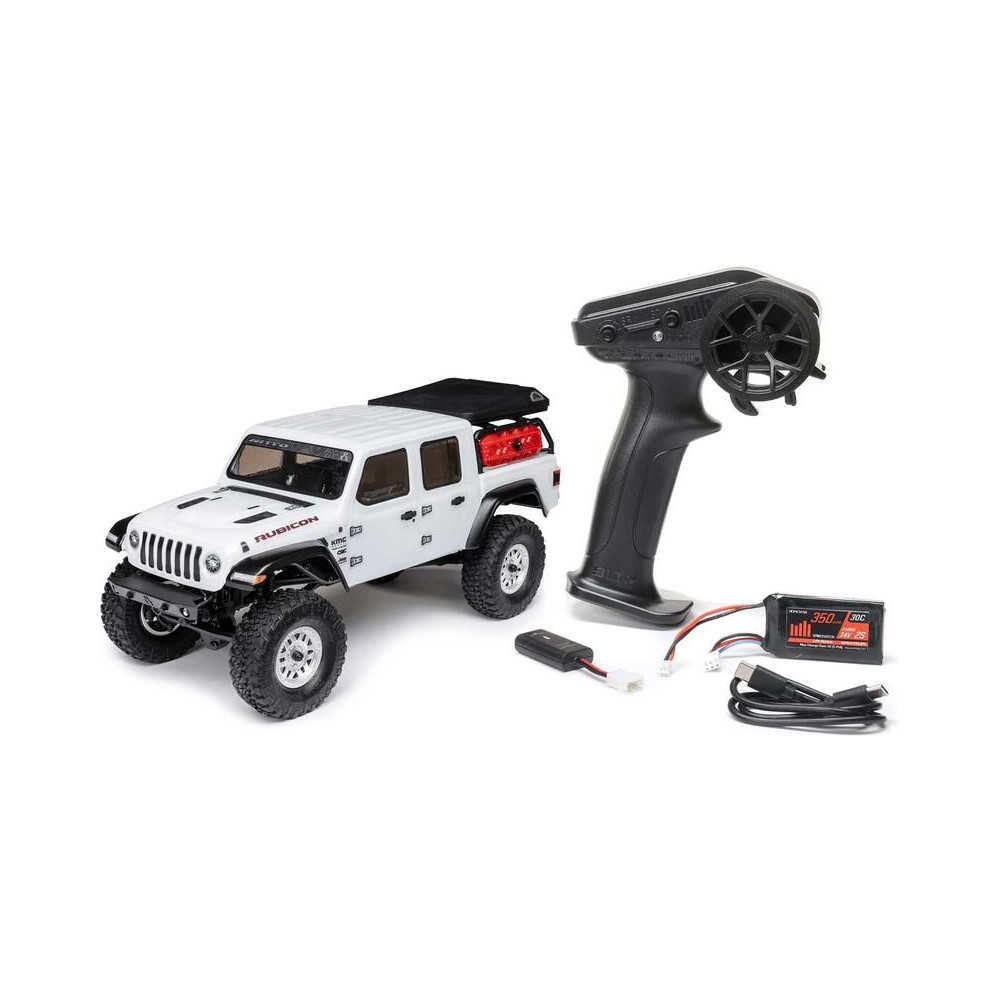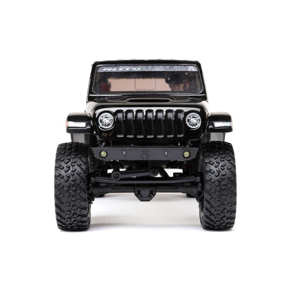 1:24 méretarányú RC modell autó Axial SCX24 Jeep JT Gladiator V2 karosszériával és LED világítással az első lökhárítóban. A csomagban minden megtalálható, amire szüksége van. A modell a bevált off-road egyedi SCX24 alváz mellett új vezérlőegységgel és Spektrum RC készlettel van felszerelve. A fejlesztéseket olajjal töltött lengéscsillapítók egészítik ki, amelyek simán elnyelik az ütéseket, és a modell terepen is stabil marad. A modell üzemideje akár 40 perc is lehet.