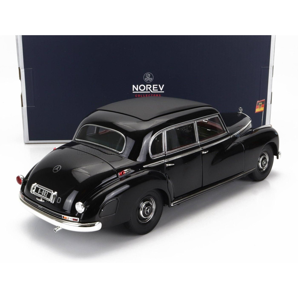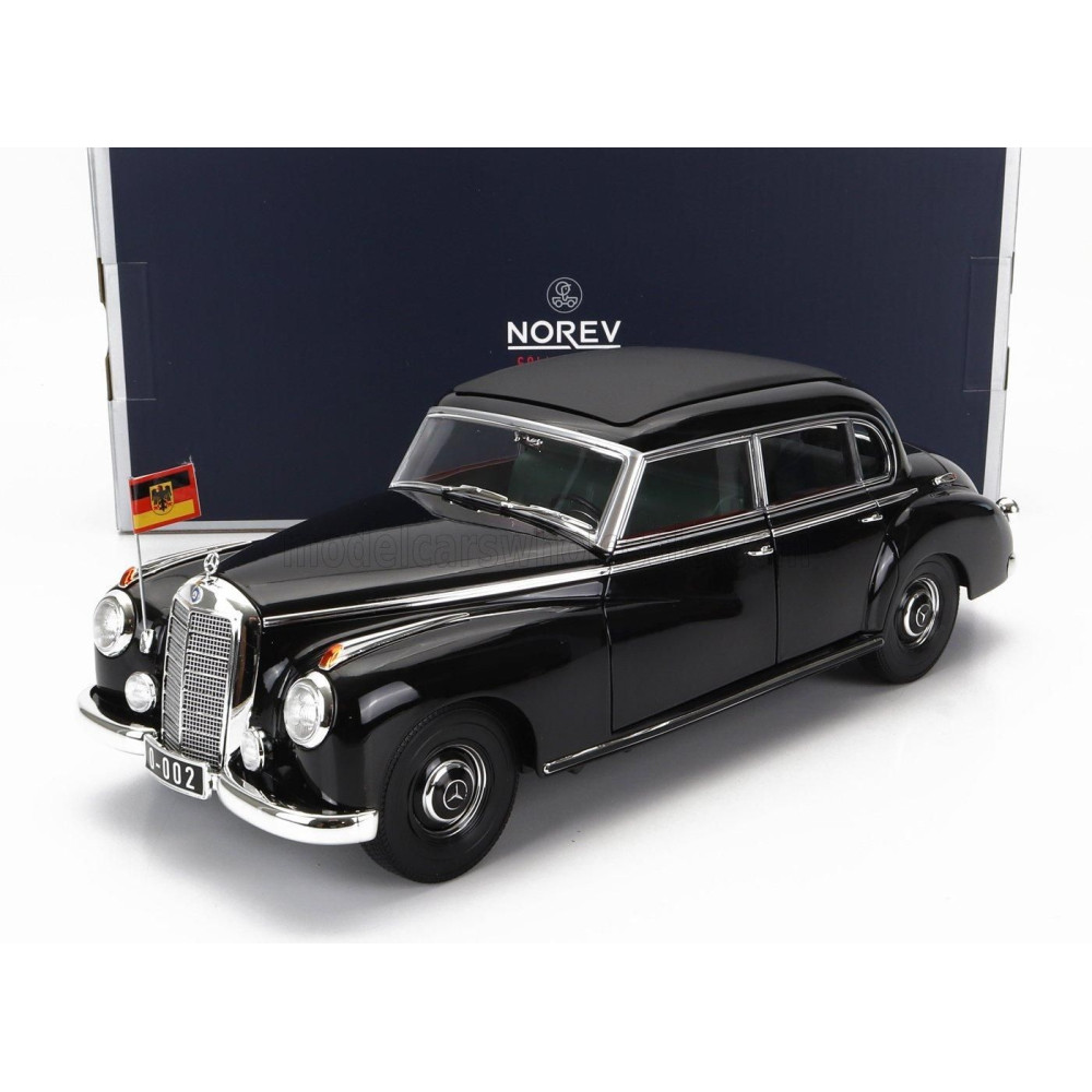 A NOREV Mercedes Benz 300B (W186) limuzin 1955-ös modell autótörténetének egyik legjellegzetesebb darabja. Ez a luxusautó, amit a Konrad Adenauer német kancellár személygépkocsijaként ismerték meg, fekete színével és részletgazdag kidolgozásával hűen tükrözi a korszak eleganciáját.