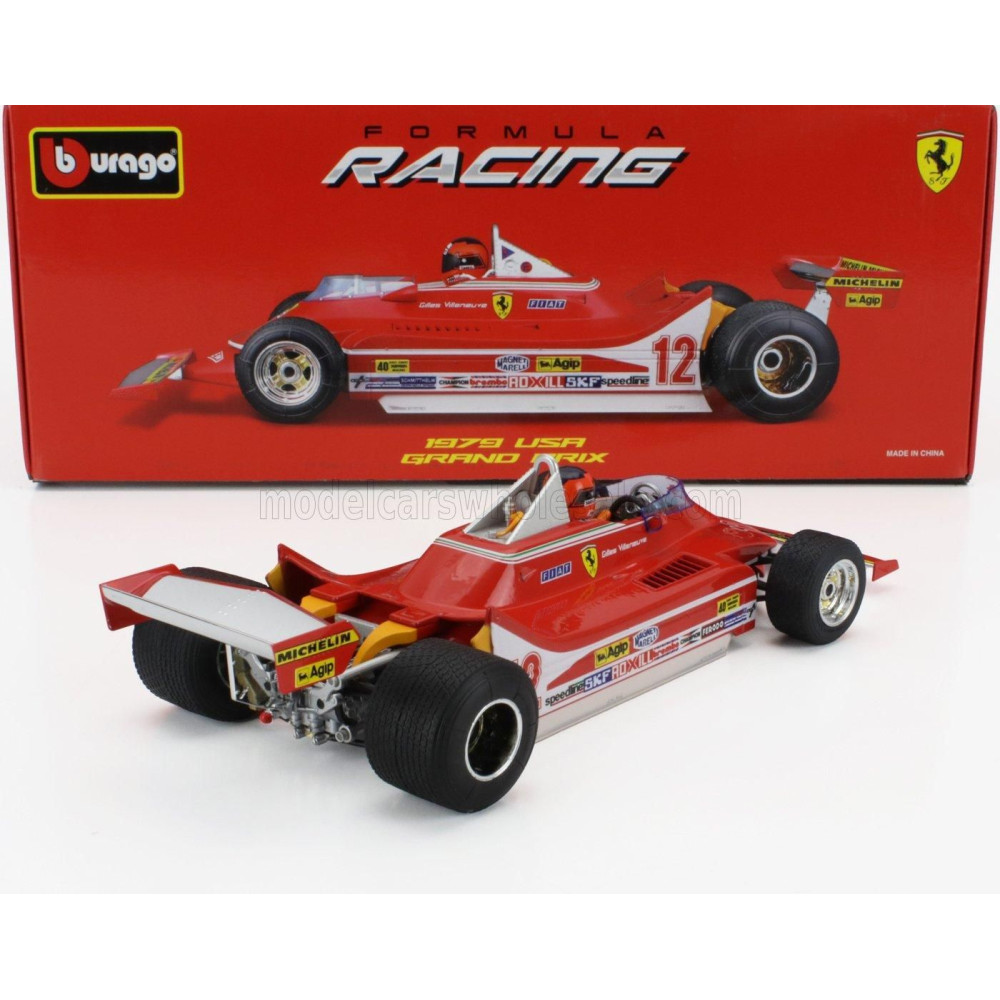 BURAGO FERRARI F1 312T4 N 12 GYŐZTES WATKINS GLEN GP USA (PILÓTA FIGURÁVAL ÉS ESŐKEREKEKKEL) 1979 GILLES VILLENEUVE - PIROS 1/18
