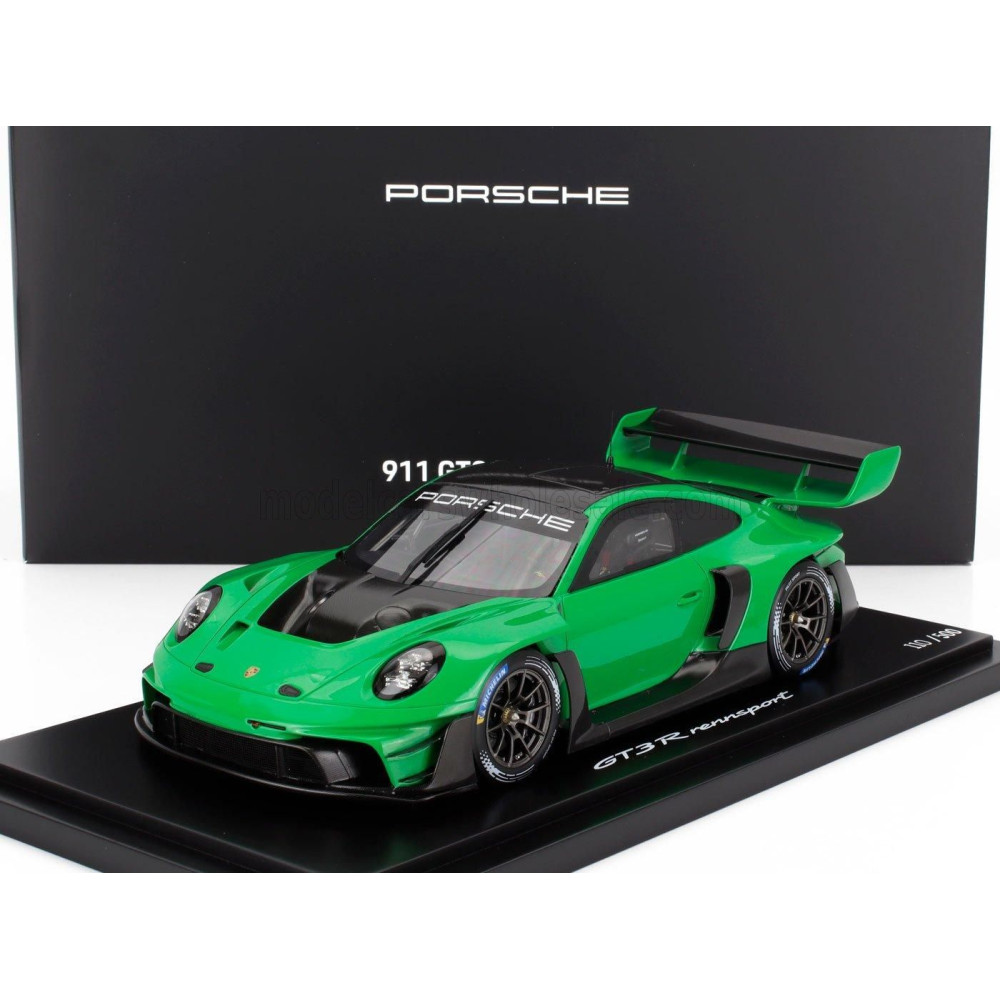 SPARK MODELL PORSCHE 911 992 GT3 RN 0 RACING COUPE 2023 - CON VETRINA - VITRINNAL - ZÖLD FEKETE 1/18