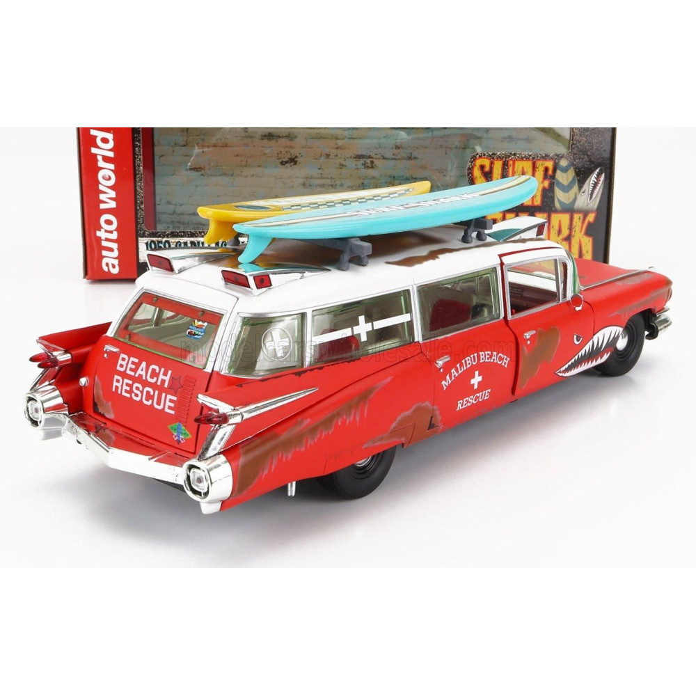 AUTOWORLD CADILLAC ELDORADO MENTŐAUTÓ CÁPA GRAFIKÁVAL ÉS SZÖRFDESZKÁKKAL 1959 - PIROS-FEHÉR 1/18