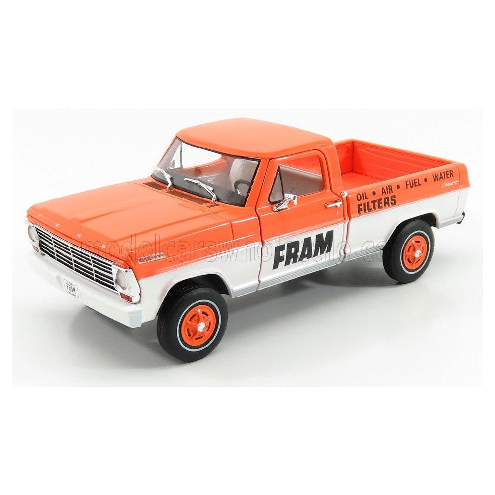 A GREENLIGHT FORD USA F-100 PICK-UP FRAM 1967 egy lenyűgöző méretarányos modellautó, mely az 1967-es év Ford F-100-as pick-upját idézi meg. Az autó karosszériája narancssárga-fehér színkombinációban pompázik, hűen visszaadva az eredeti jármű megjelenését.