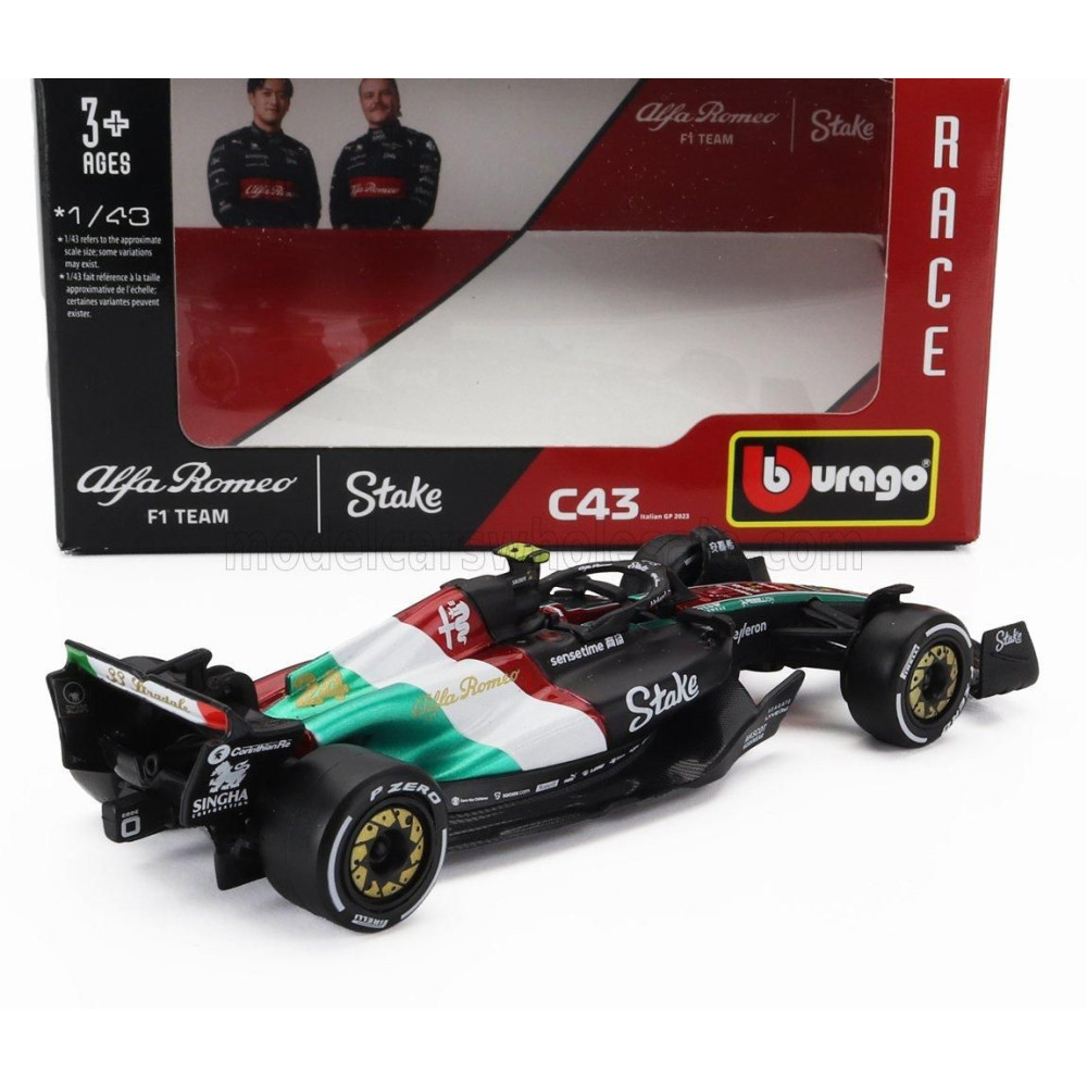 BURAGO ALFA ROMEO F1 C43 TEAM STAKE N 24 MONZA OLASZORSZÁG GP 2023 GUANYU ZHOU - FEKETE PIROS FEHÉR ZÖLD 1/43