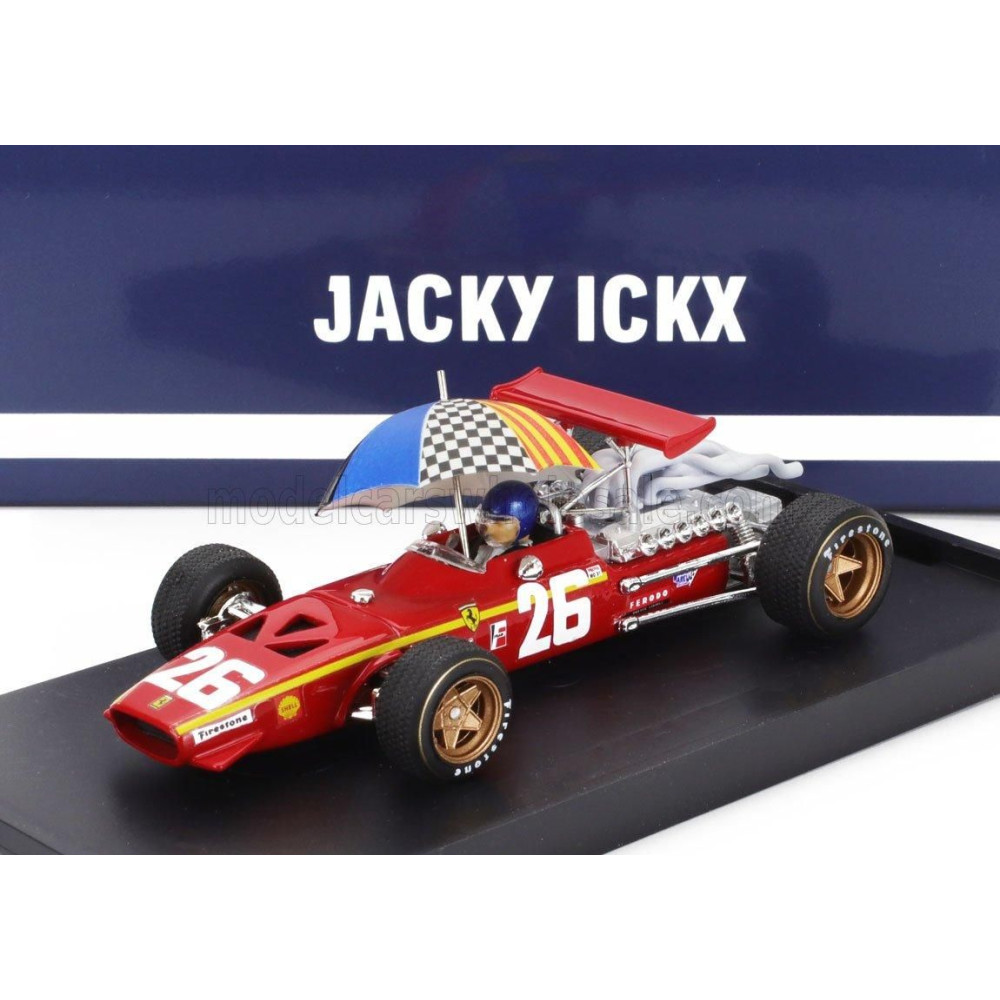 BRUMM FERRARI F1 312 N 26 1968-AS FRANCIA GP GYŐZTES, JACKY ICKX - PILÓTA FIGURÁVAL ÉS ESERNYŐVEL - PIROS-FEHÉR 1/43