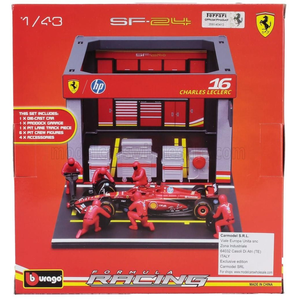 BURAGO FERRARI F1 SF-24 DIORÁMA GARÁZS PIT-STOP TEAM SCUDERIA FERRARI N 16 SZEZON 2024 CHARLES LECLERC CSAPATÁVAL ÉS KIEGÉSZÍTŐK