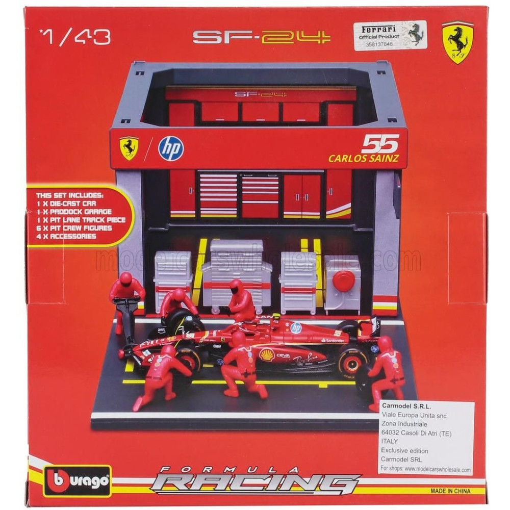 BURAGO FERRARI F1 SF-24 DIORÁMA GARÁZS PIT-STOP TEAM SCUDERIA FERRARI N 55 SZEZON 2024 CARLOS SAINZ CSAPAT FIGURÁVAL ÉS ALKALMAS