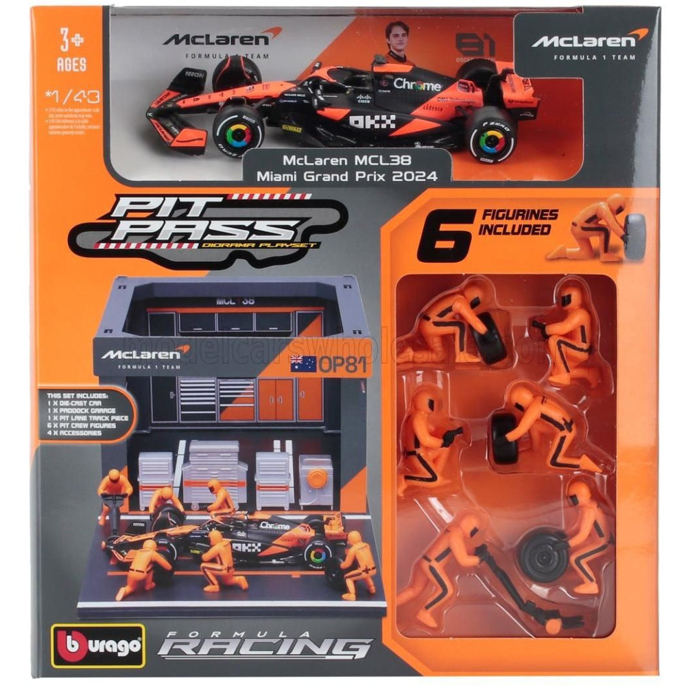 BURAGO McLaren F1 MCL38 DIORÁMA GARÁZS PIT-STOP TEAM MCLAREN N 81 SZEZON 2024 OSCAR PIASTRI CSAPAT FIGURÁVAL ÉS KIEGÉSZÍTŐKKEL -