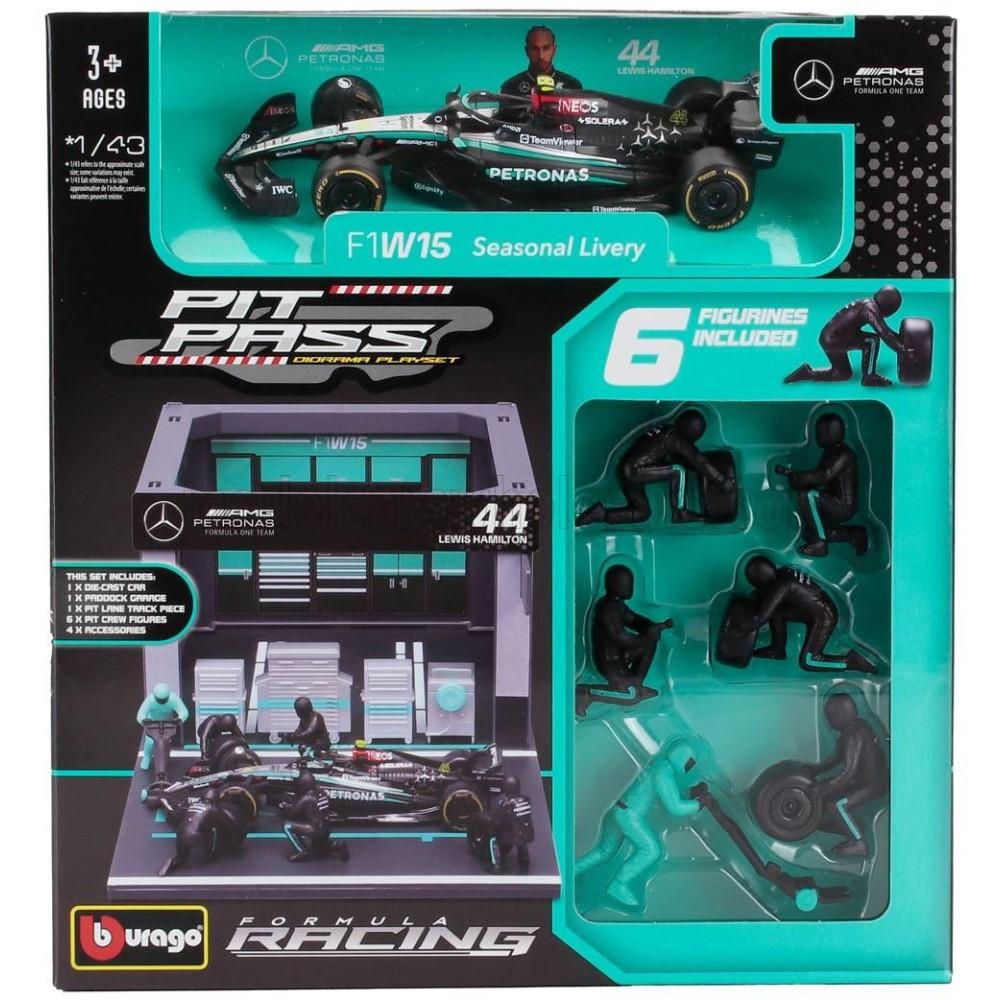 BURAGO MERCEDES GP F1 W15 EQ PERFORMANCE DIORÁMA GARÁZS PIT-STOP TEAM AMG PETRONAS MOTORSPORT N 44 2024-ES SZEZON LEWIS HAMILTON
