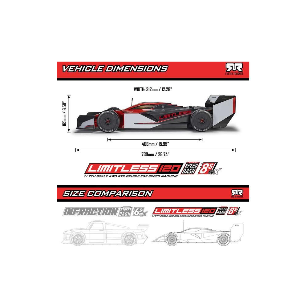 Az Arrma Limitless 8S BLX 1:7 RC autómodell egy különleges közúti autó, amelyet tapasztalt vezetők számára terveztek, 110 km/h feletti sebességgel , vagy a mellékelt sebességcsomaggal akár 190 km/h sebességgel . AC motorral és Spektrum 160A szabályozóval, erős szervóval, DX3 adóval és vevővel AVC stabilizációval rendelkezik.