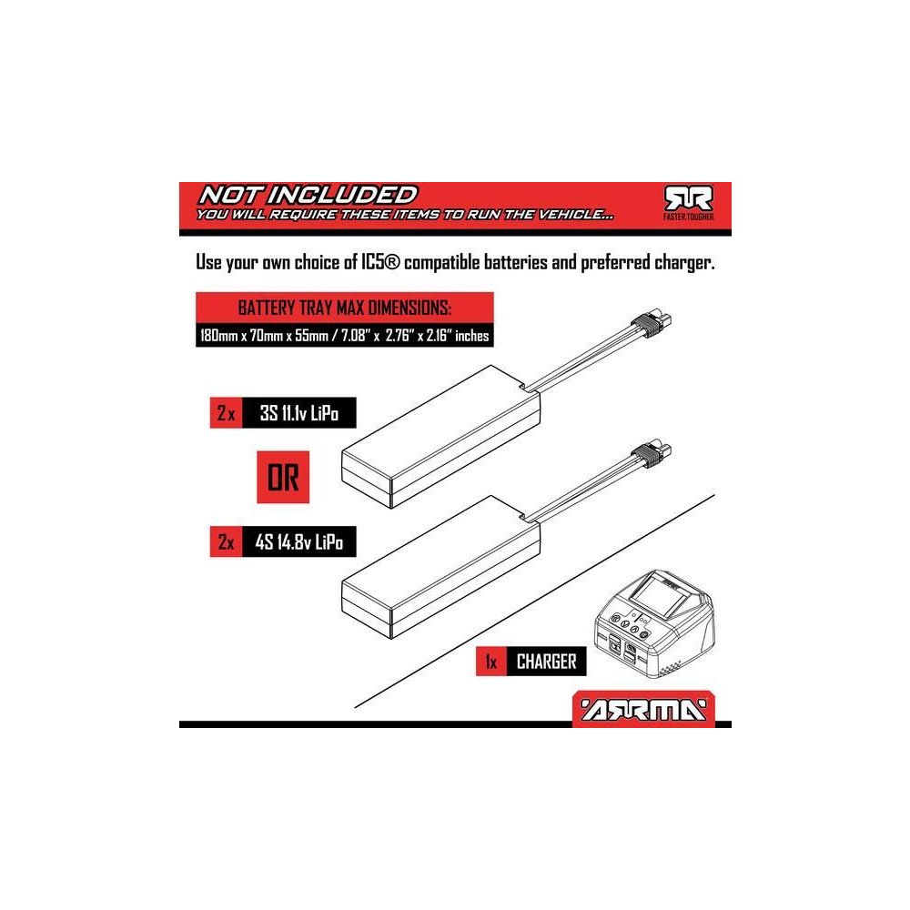 Az autó vezetéséhez 2 szett LiPo akkumulátorra van szükség (2x 3S LiPo vagy 2x 4S LiPo), amelyeknek bőséges hely áll rendelkezésre. Az akkumulátorok tépőzáras keresztpántokkal rögzíthetők, így nagyon jól a helyükön maradnak, és cseréjük egyszerű.