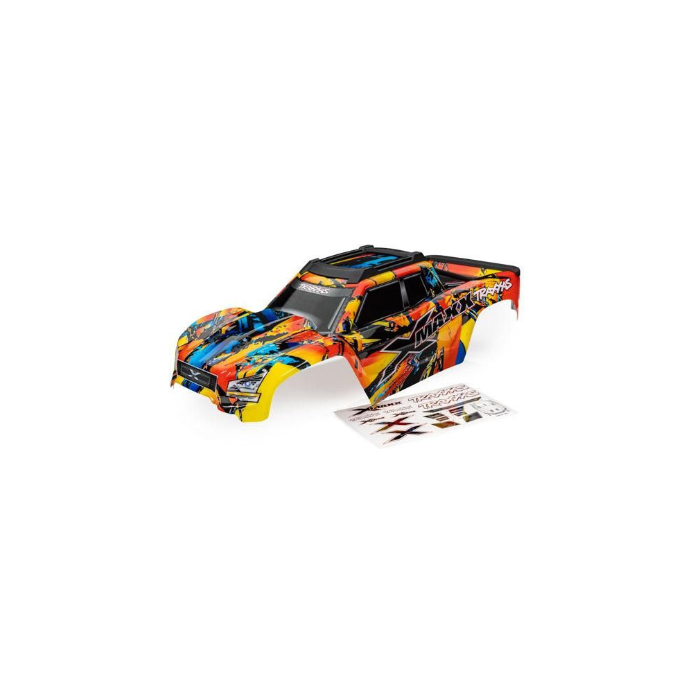 Traxxas X-Maxx Solar Flare karosszéria - festett, matricákkal ellátott, beleértve a vázat és a védőelemeket.