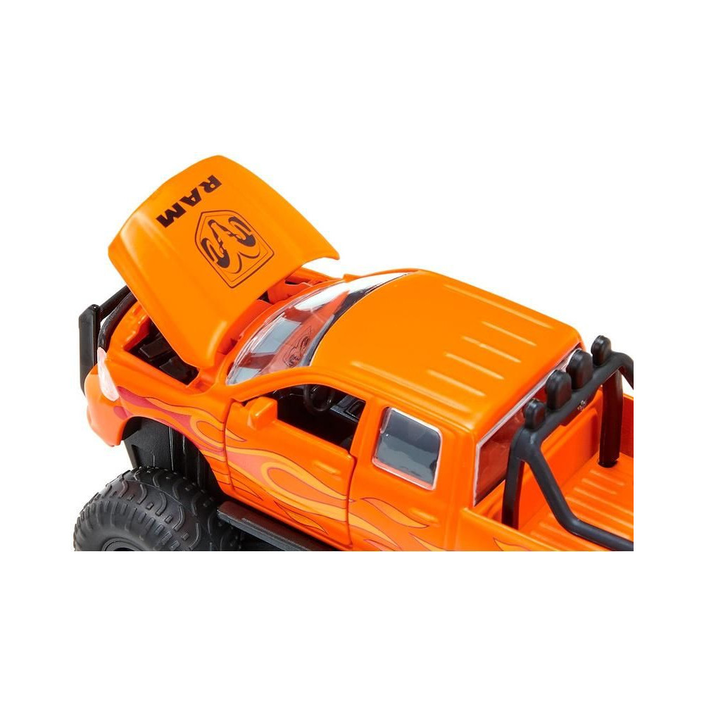 RAM 1500 fém modell 1:50 méretarányban. Nyitható oldalsó ajtók és motorháztető. Cserélhető kerekek. Funkcionális felfüggesztés. Részletes kivitelezés, beleértve a karosszériavázat és a ballonos gumiabroncsokat. Játékra és gyűjtésre alkalmas. Minőségi kivitelezés fémből és műanyagból.