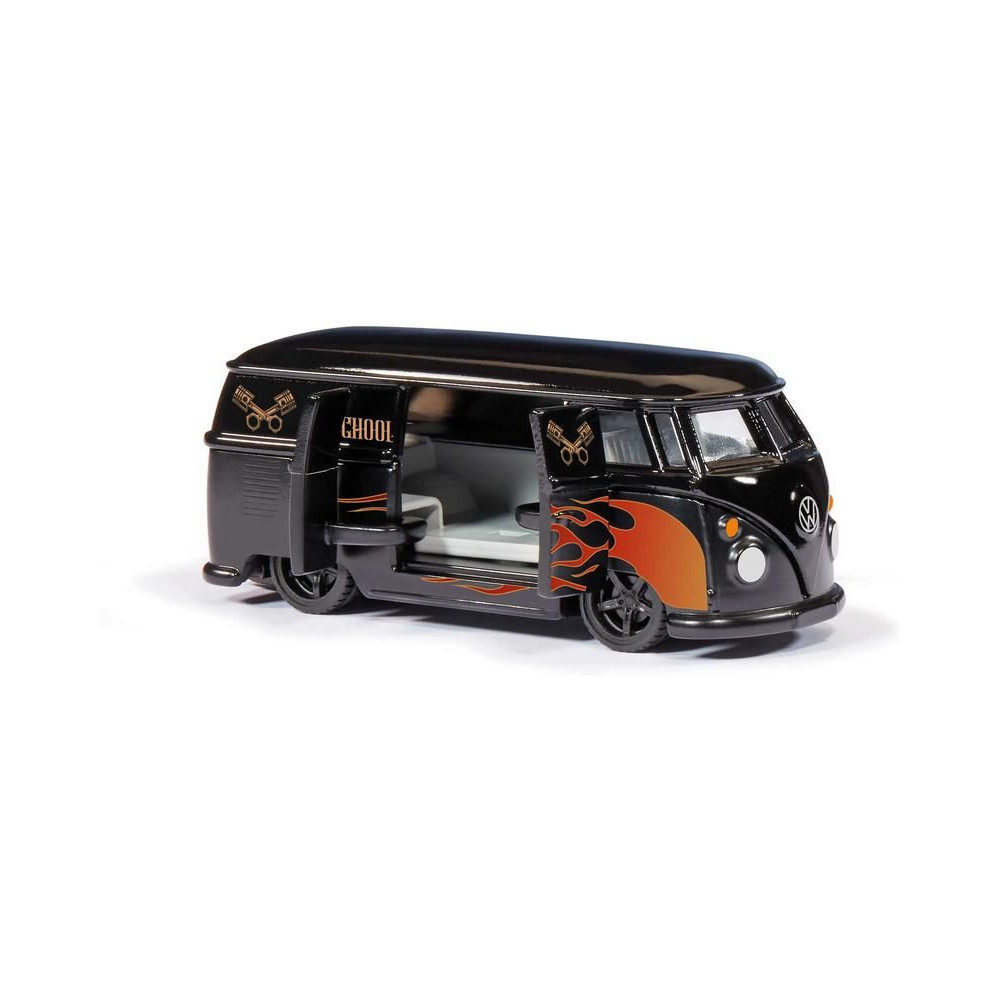Volkswagen T1 kisbusz fém modellje 1:50 méretarányban. Legendás modell az 50-es évekből, népszerű a hippik körében, részletes kidolgozású modellként, jobb oldalon nyitható ajtókkal. Fekete festés lángokkal. Játékra és gyűjtésre alkalmas. Minőségi kivitelezés fémből és műanyagból.