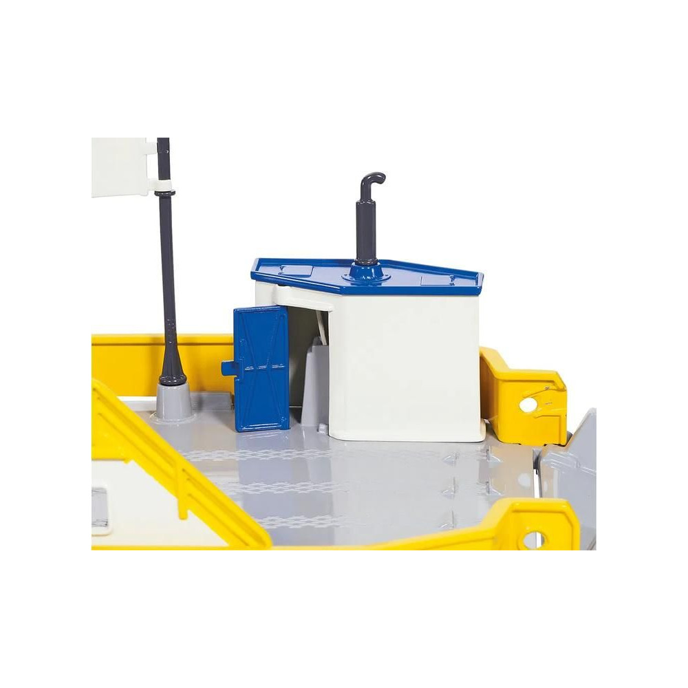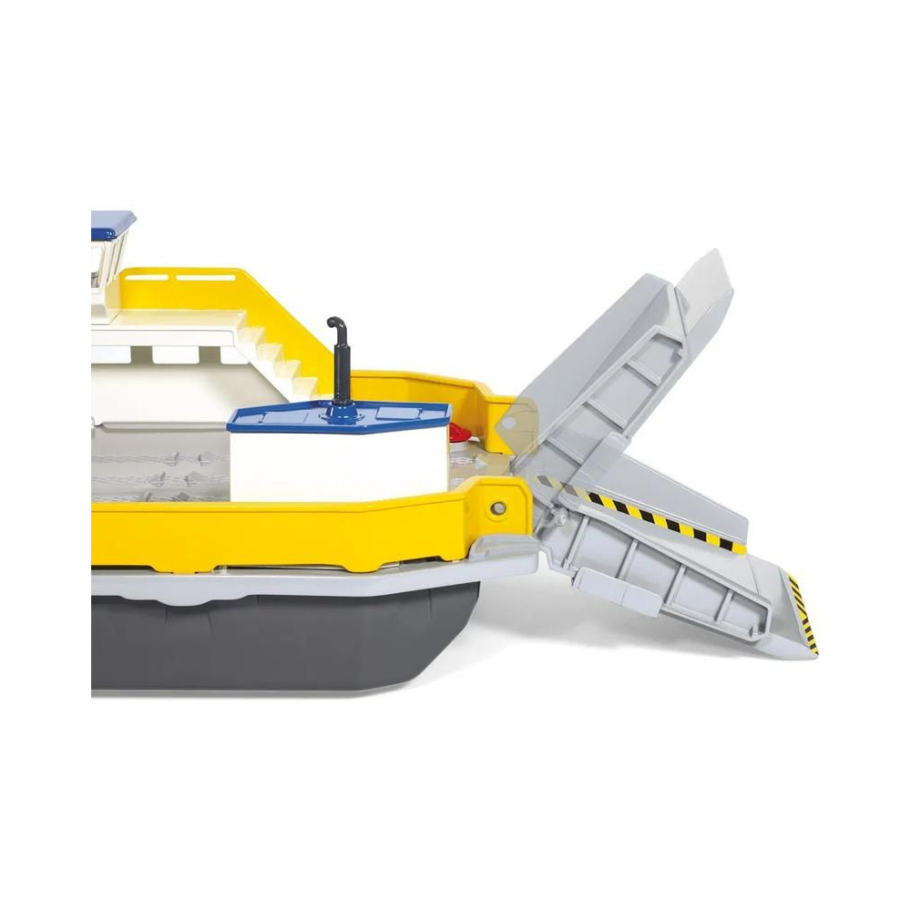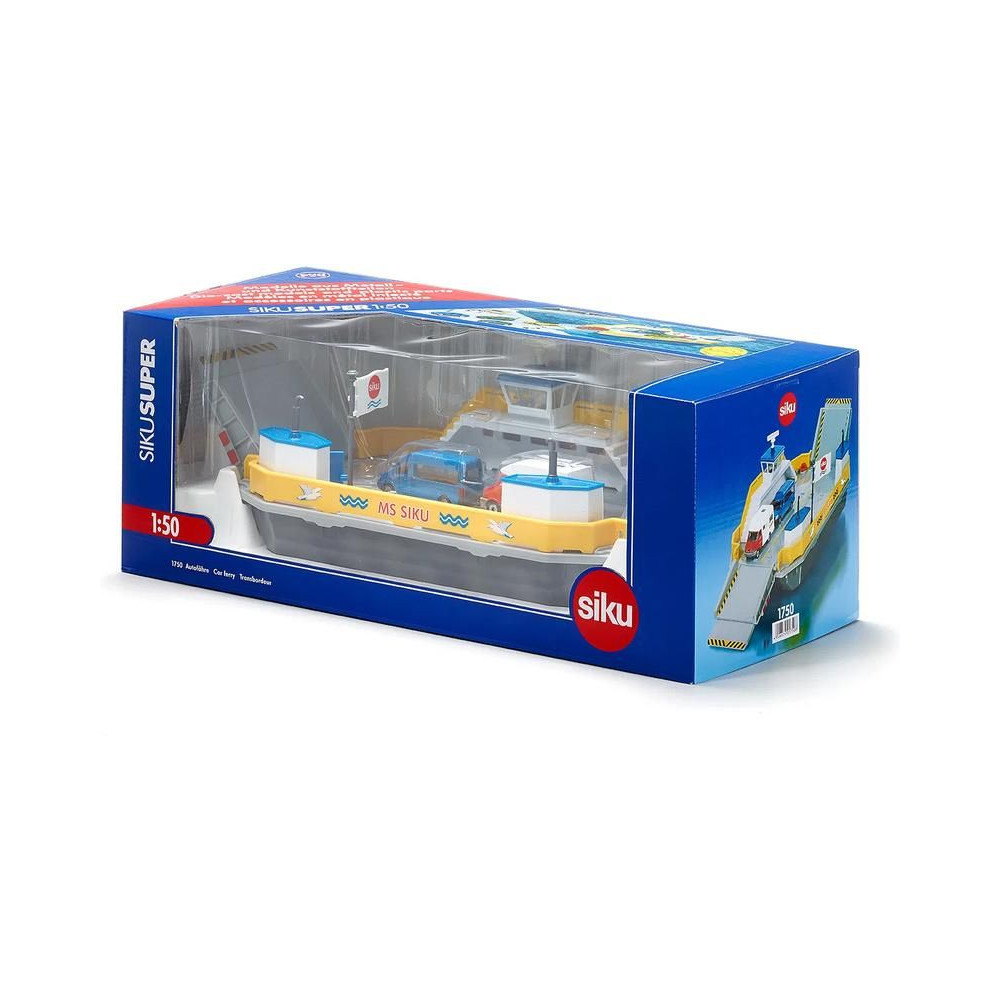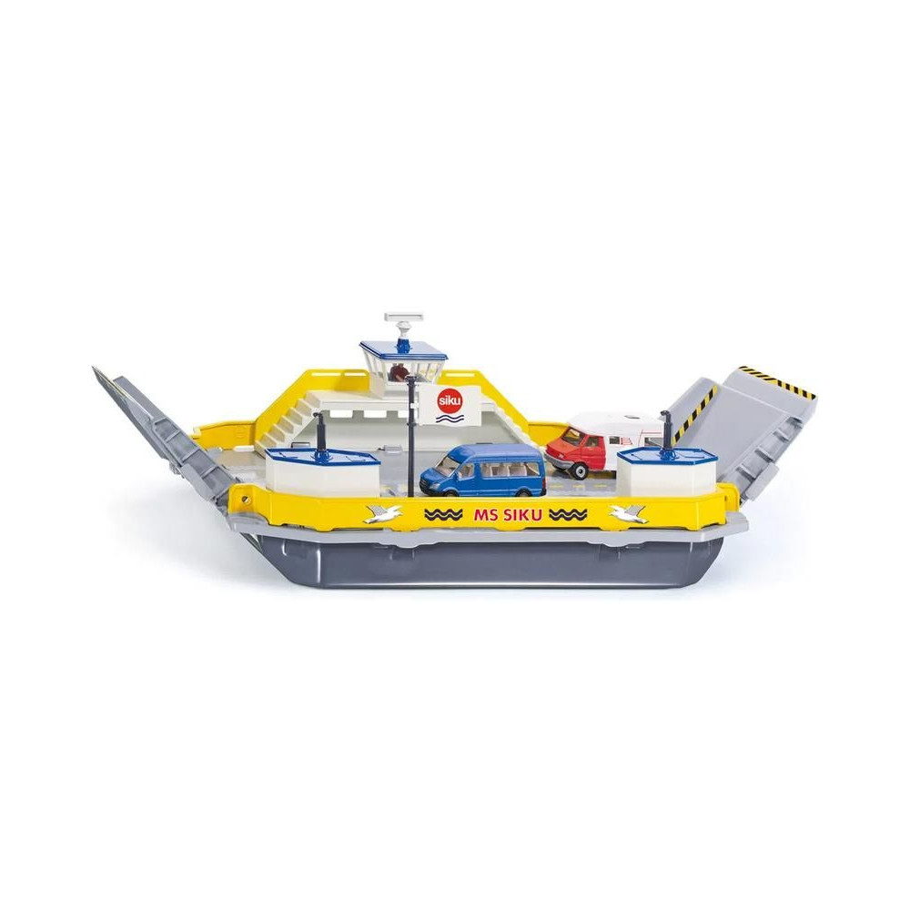Siku márkájú, fémből készült, úszó komp modell 1:50 méretarányban. A modell számos részletet tartalmaz, beleértve két összecsukható rámpát, a kabin nyitható ajtóit és két autót a szállításhoz. Játékra és gyűjtögetésre is alkalmas. Minőségi fém- és műanyagmegmunkálás.