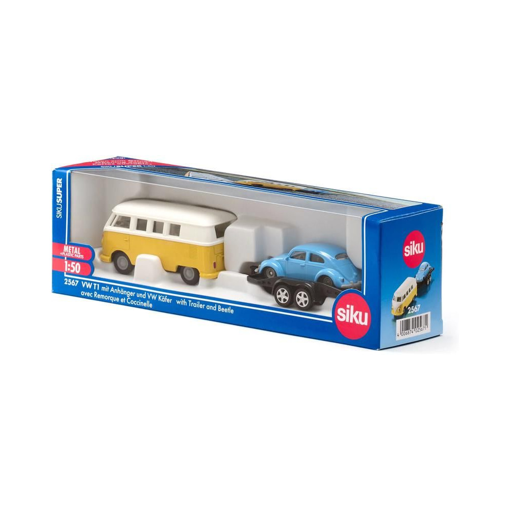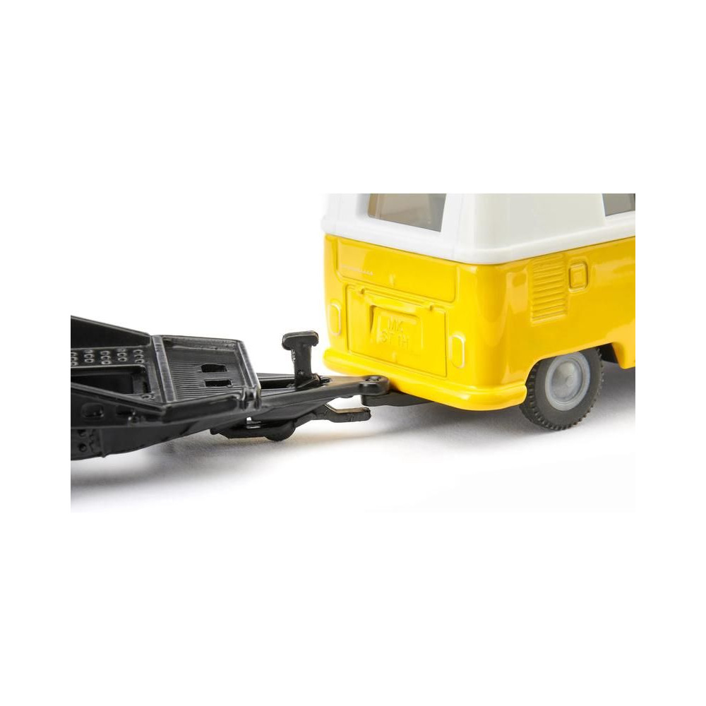 Volkswagen T1 kisbusz fémmodell utánfutóval és Bogár modell 1:50 méretarányban. Két legendás modell egy funkcionális szettben. A Volkswagen T1 jobb oldalon nyitható ajtóval rendelkezik, az utánfutó levehető, a kerekek gumiból készültek. Játékra és gyűjtögetésre is alkalmas. Minőségi fém- és műanyag kidolgozás.