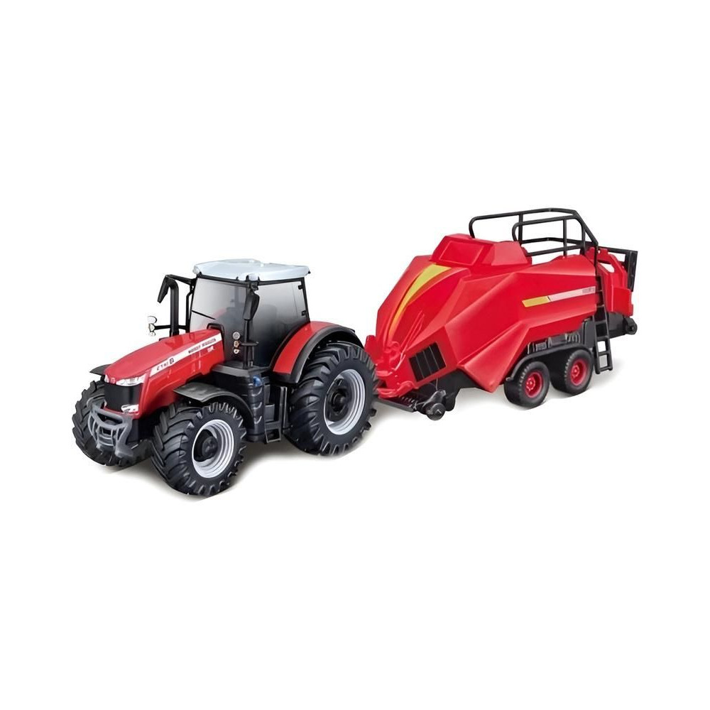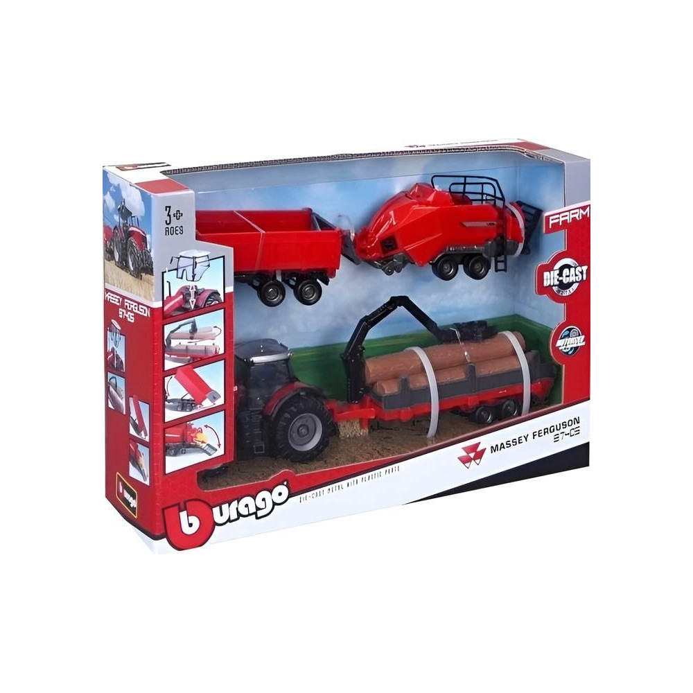 A Bburago modell - A Massey Ferguson 8740S traktor kiegészítőkkel együtt műanyag alkatrészekből készült. A modell lendkeréken áll, hátsó zsanérral rendelkezik a burkolat csatlakoztatásához, és részletesen kidolgozott.