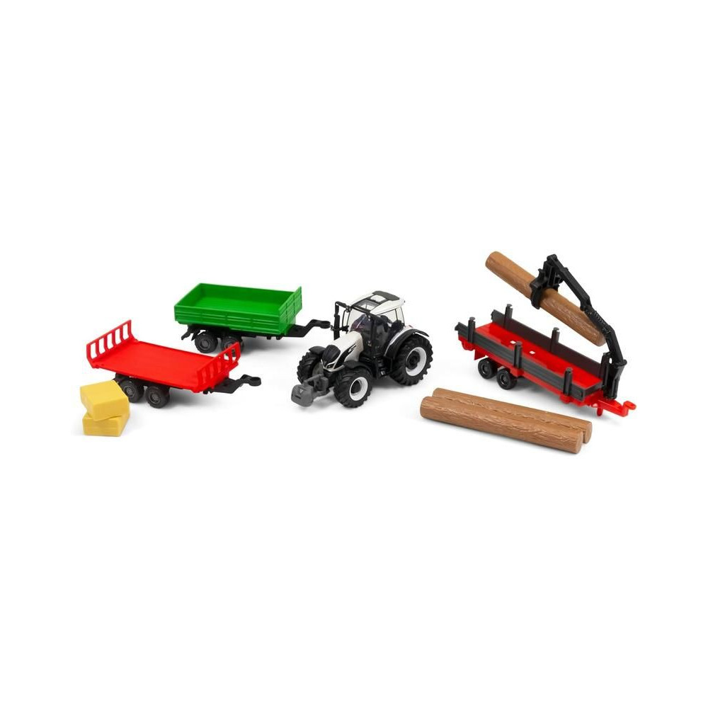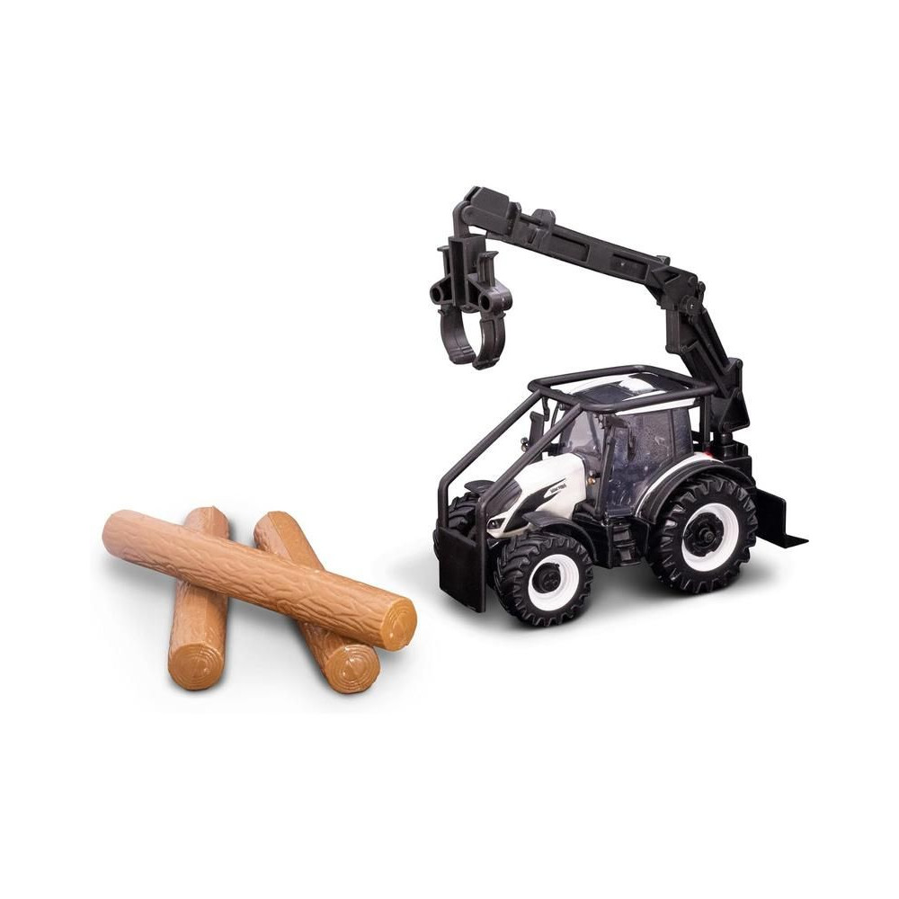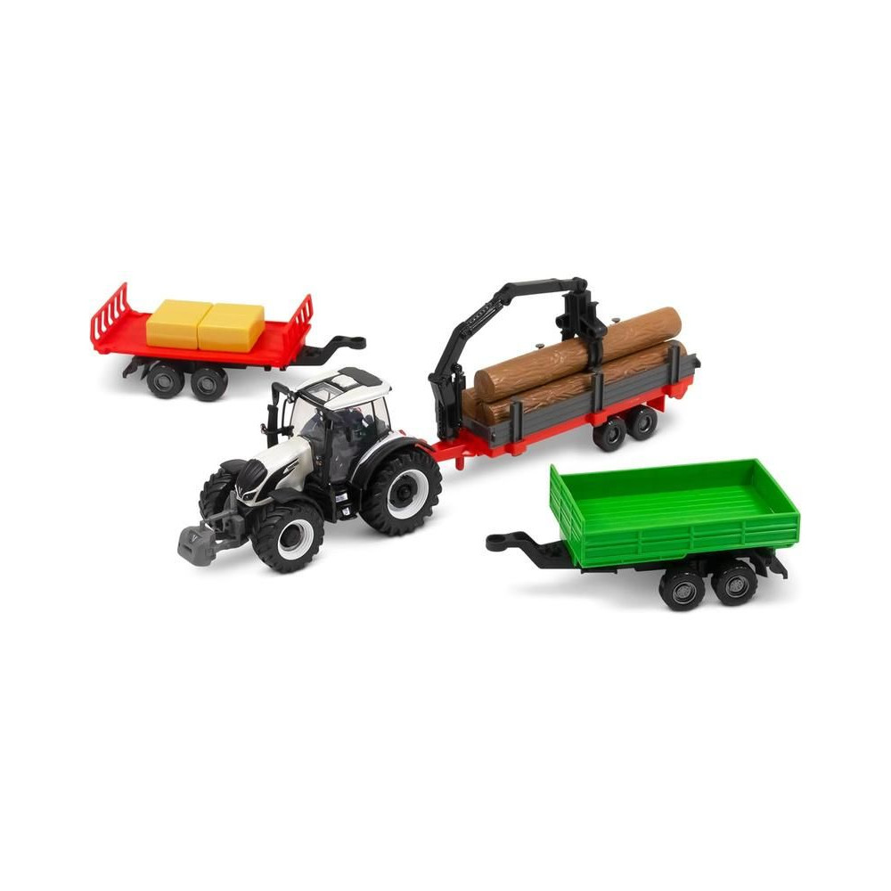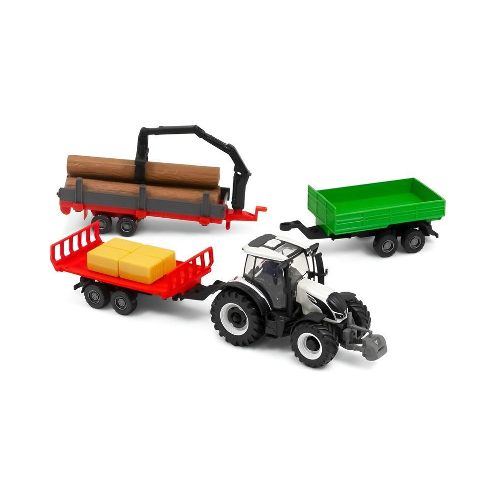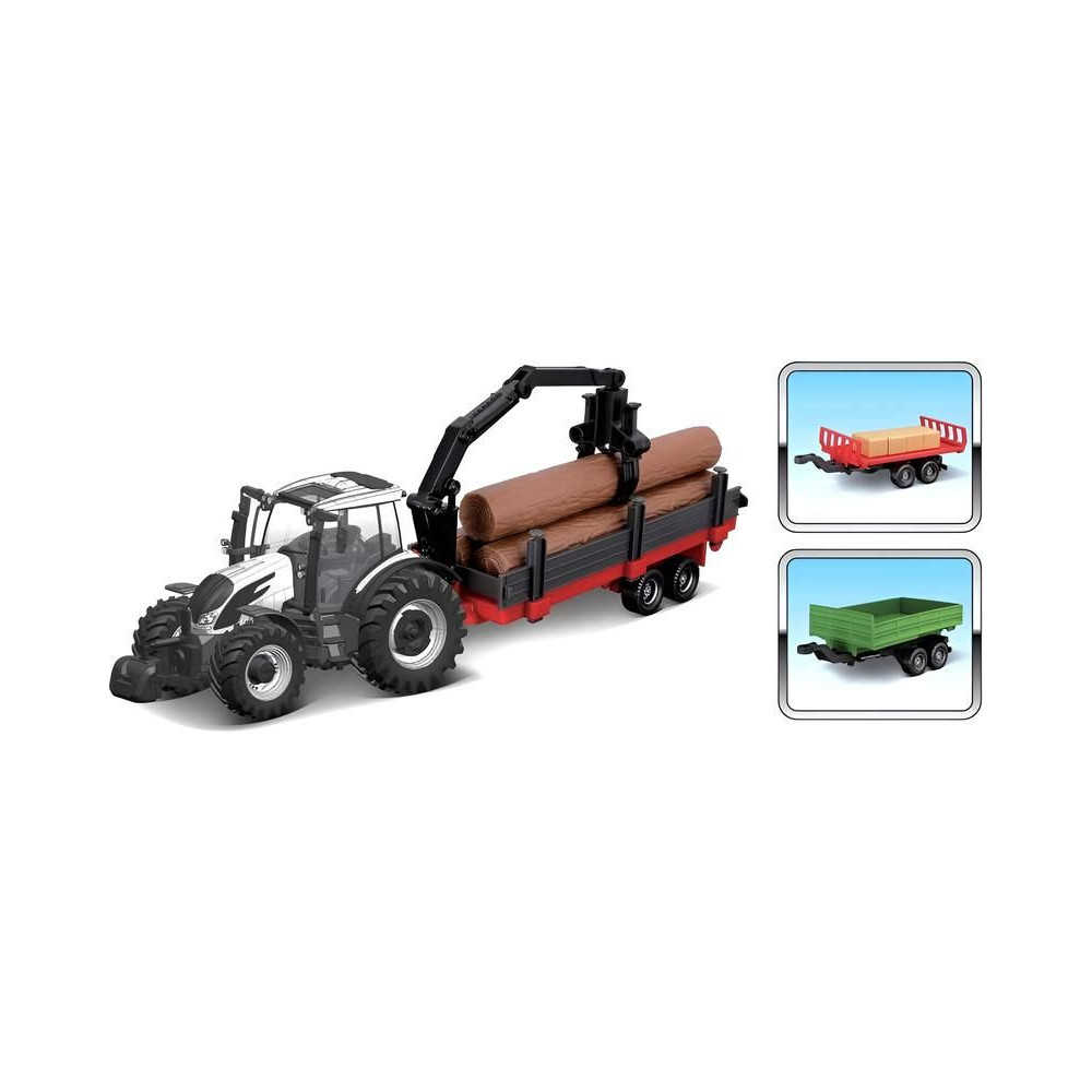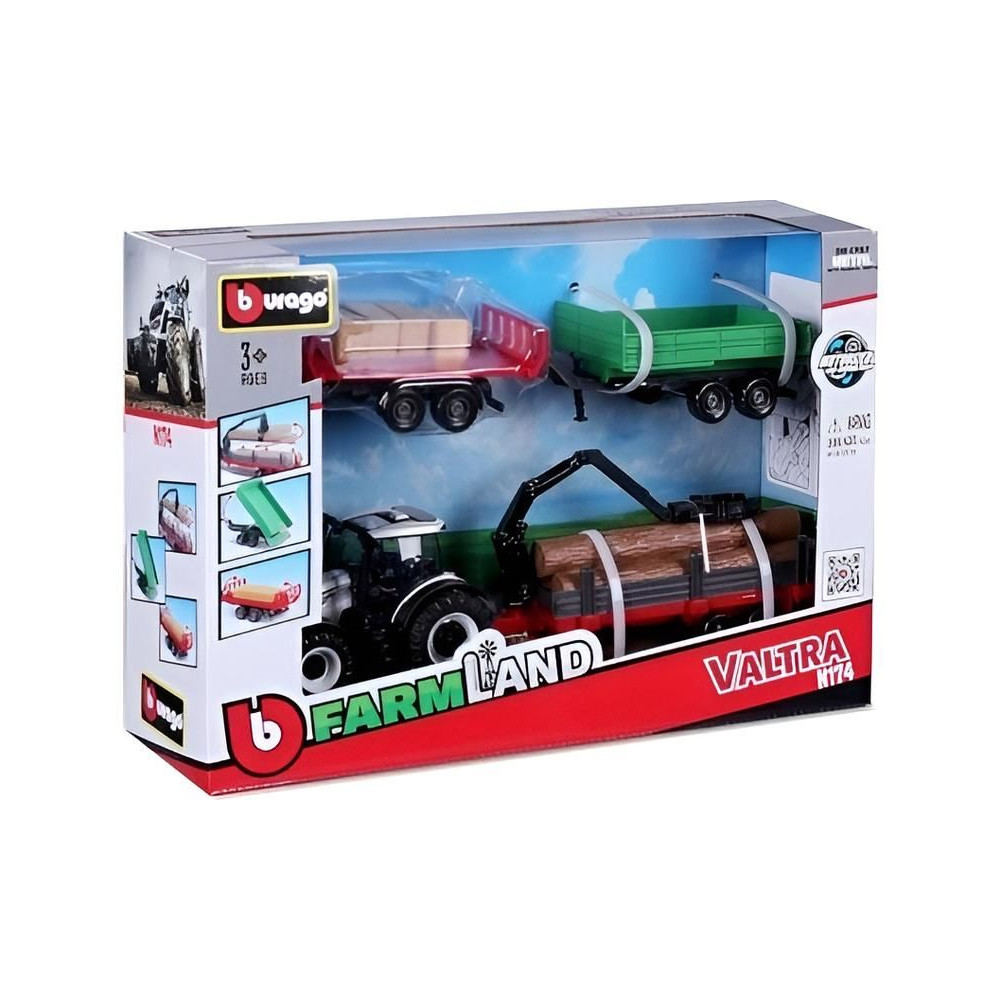 Bburago Valtra N174 mezőgazdasági traktor tartozékokkal. Műanyag alkatrészekből készült. A modell gumikerekekkel van felszerelve a lendkeréken, és levehető vezetőfülkével rendelkezik. A pótkocsival ellátott traktor mérete körülbelül 26 cm.