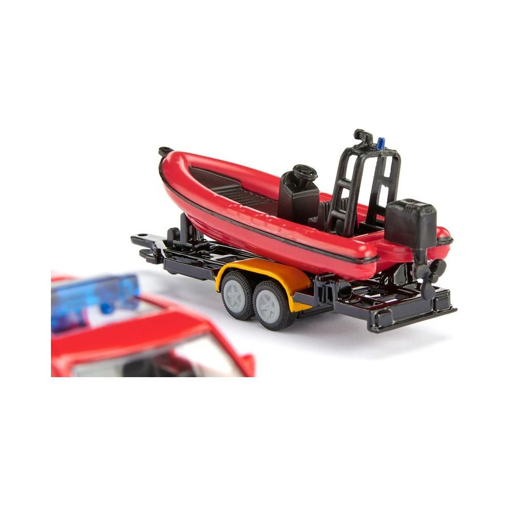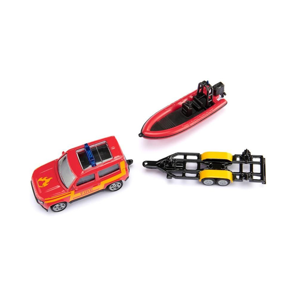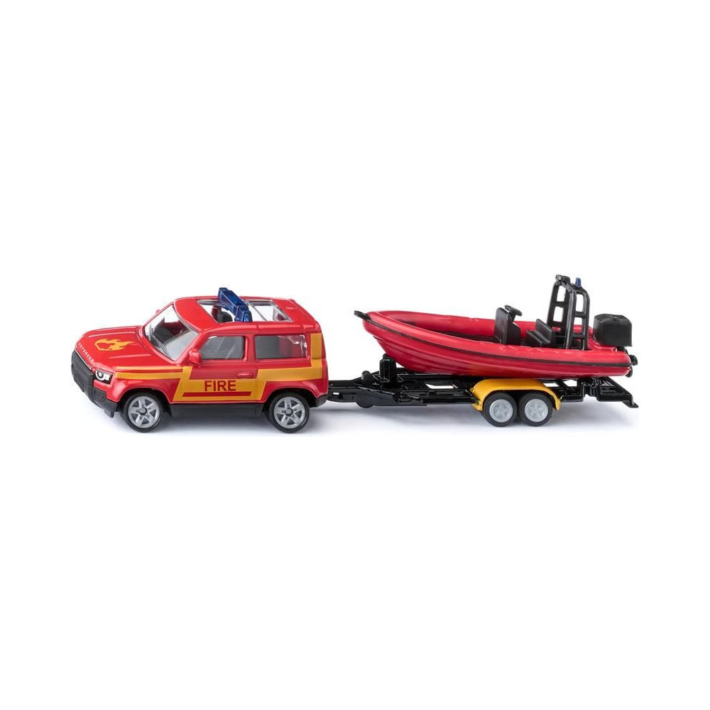 1:50 méretarányú, fémből készült Land Rover autó modell utánfutóval és csónakkal a Siku márkától. Az autómodell gumiabroncsokkal, átlátszó ablakokkal és kifinomult belső térrel rendelkezik. Egy levehető utánfutón egy billenőmotoros csónak található, amely ténylegesen úszik. Játékra és gyűjtögetésre is alkalmas. Minőségi fém és műanyag kidolgozás. Bliszterben csomagolva.