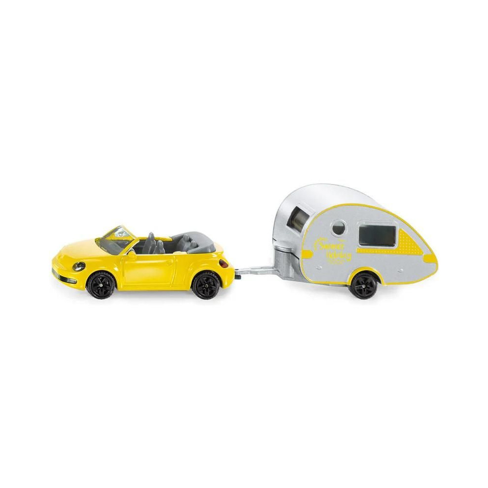 Siku VW New Beetle személyautó lakókocsival ellátott fém modellje, hossza kb. 16 cm, méretarány 1:55. A modell gumiabroncsokkal és kidolgozott belső térrel rendelkezik. Az utánfutó levehető és nyitható ajtóval rendelkezik. Játékra és gyűjtögetésre alkalmas. Minőségi fém és műanyag kidolgozás. Bliszterben csomagolva.