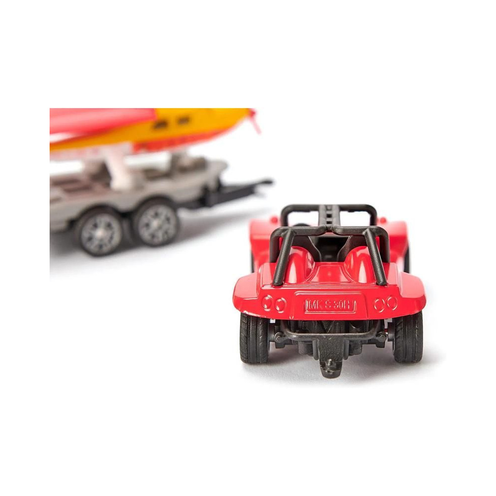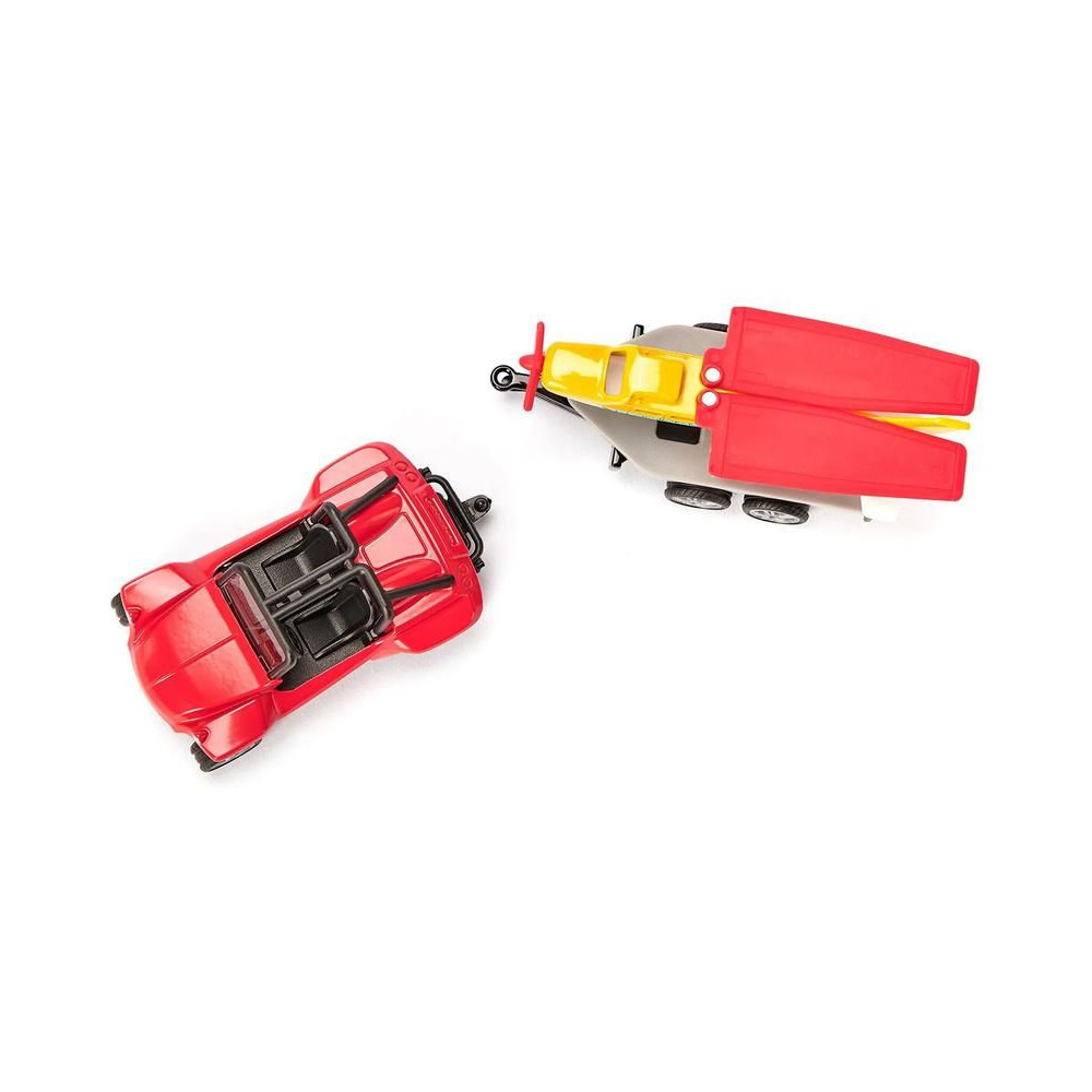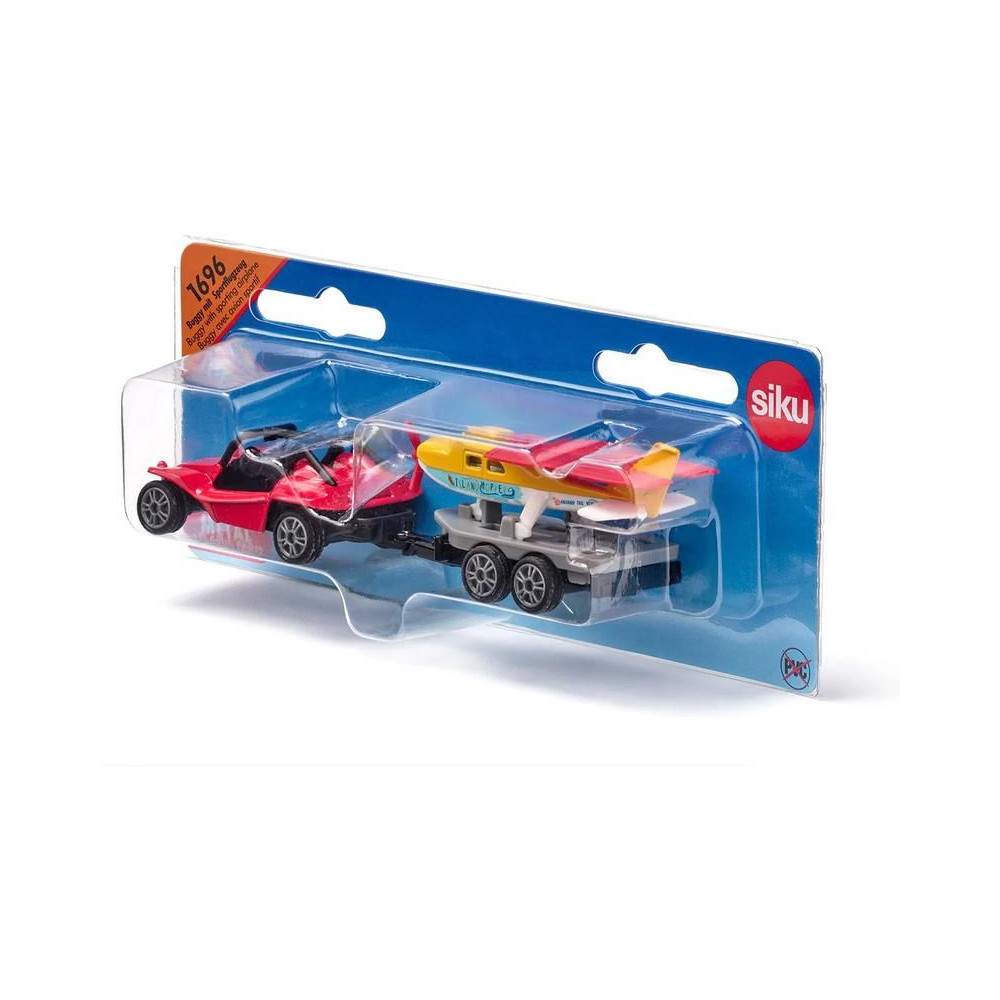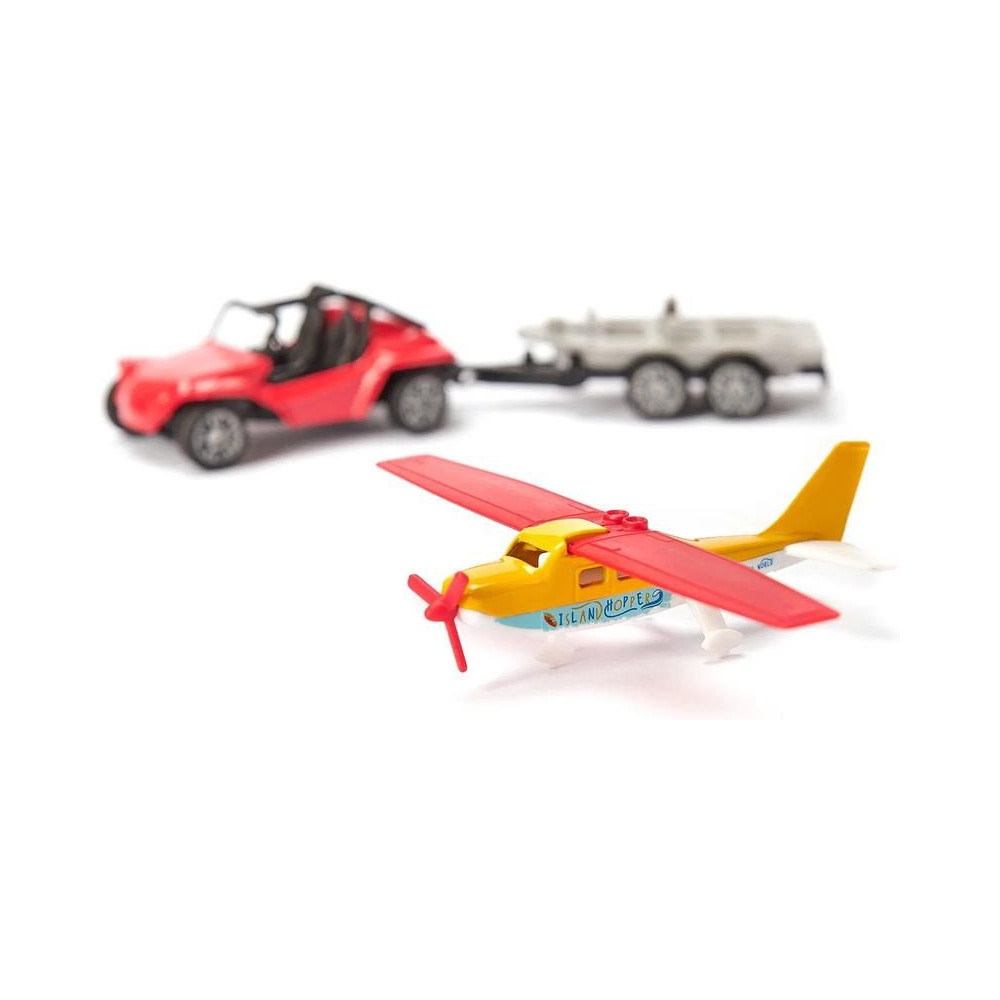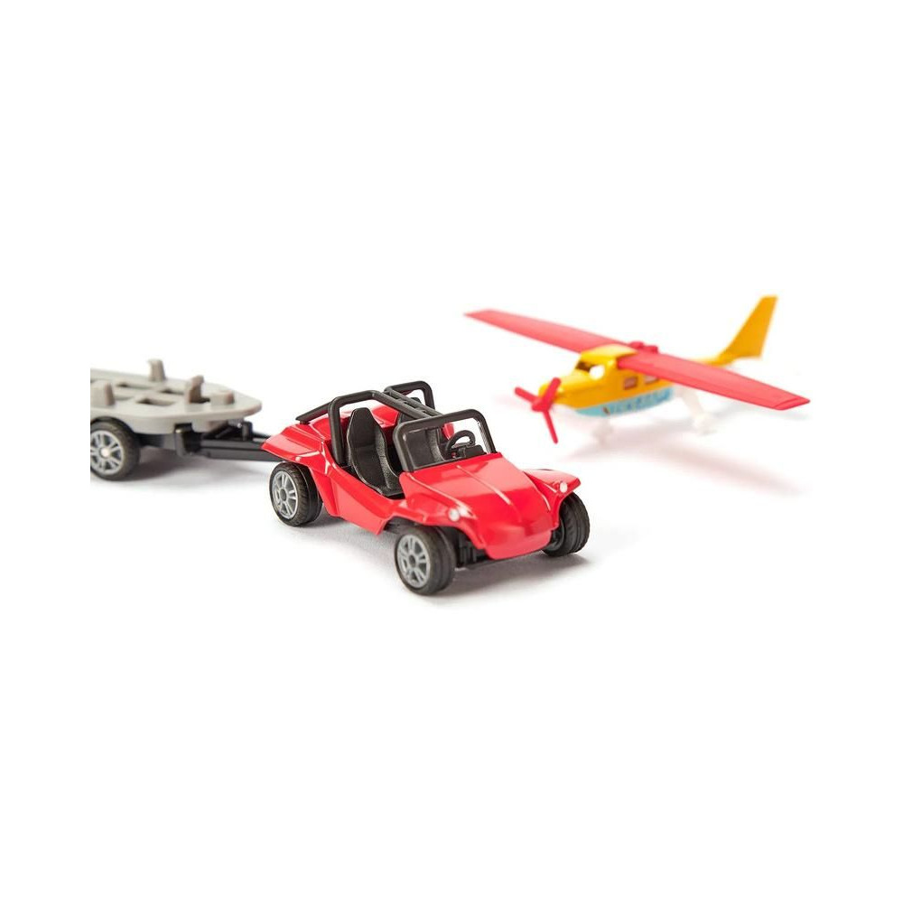 Siku fém Buggy modell utánfutóval és sportrepülővel, hossza kb. 15 cm. A buggy modell kidolgozott belső és tetővázzal rendelkezik, a kéttengelyes utánfutó levehető, a forgó propellerrel és összecsukható szárnyakkal ellátott repülőgép az utánfutón szállítható. Játékra és gyűjtögetésre alkalmas. Minőségi fém és műanyag kidolgozás. Bliszterben csomagolva.