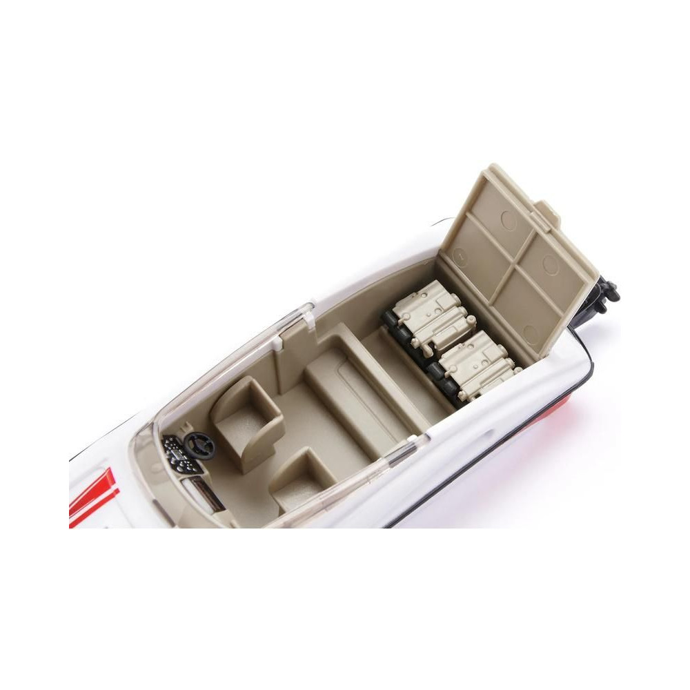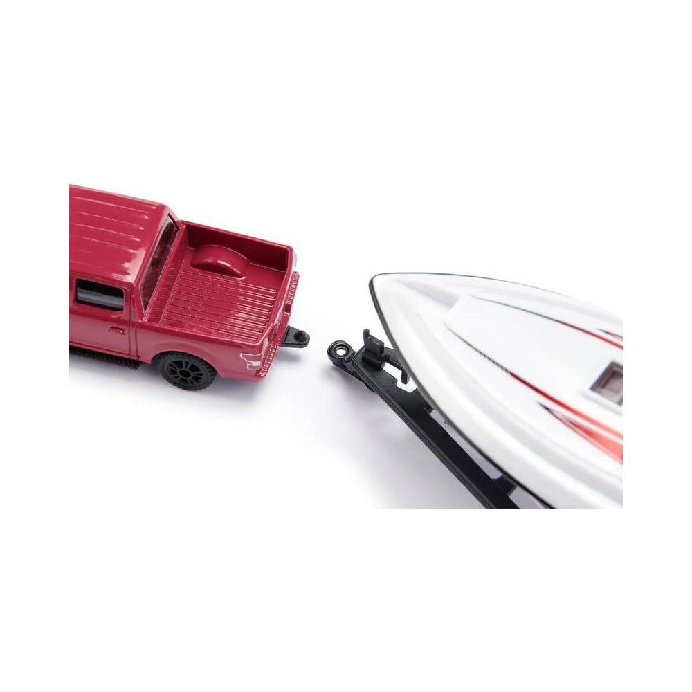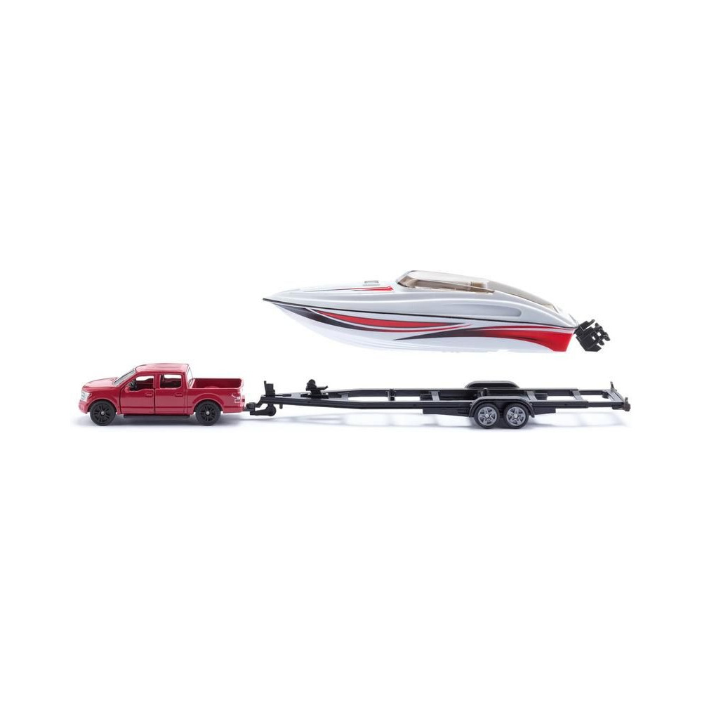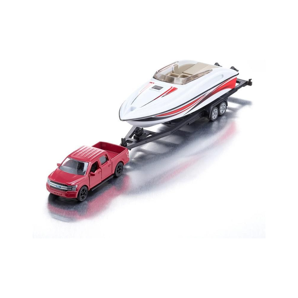 Siku márkájú, 1:55 méretarányú, fémből készült Ford F150 modellautó utánfutóval és motorcsónakkal. Az autó nyitható ajtókkal, gumikerekekkel és vonóhoroggal rendelkezik. A motorcsónak egy úszó modell, és egy felhajtható fedéllel és modellmotorral rendelkezik. Játékra és gyűjtögetésre is alkalmas. Minőségi fém és műanyag kidolgozás.