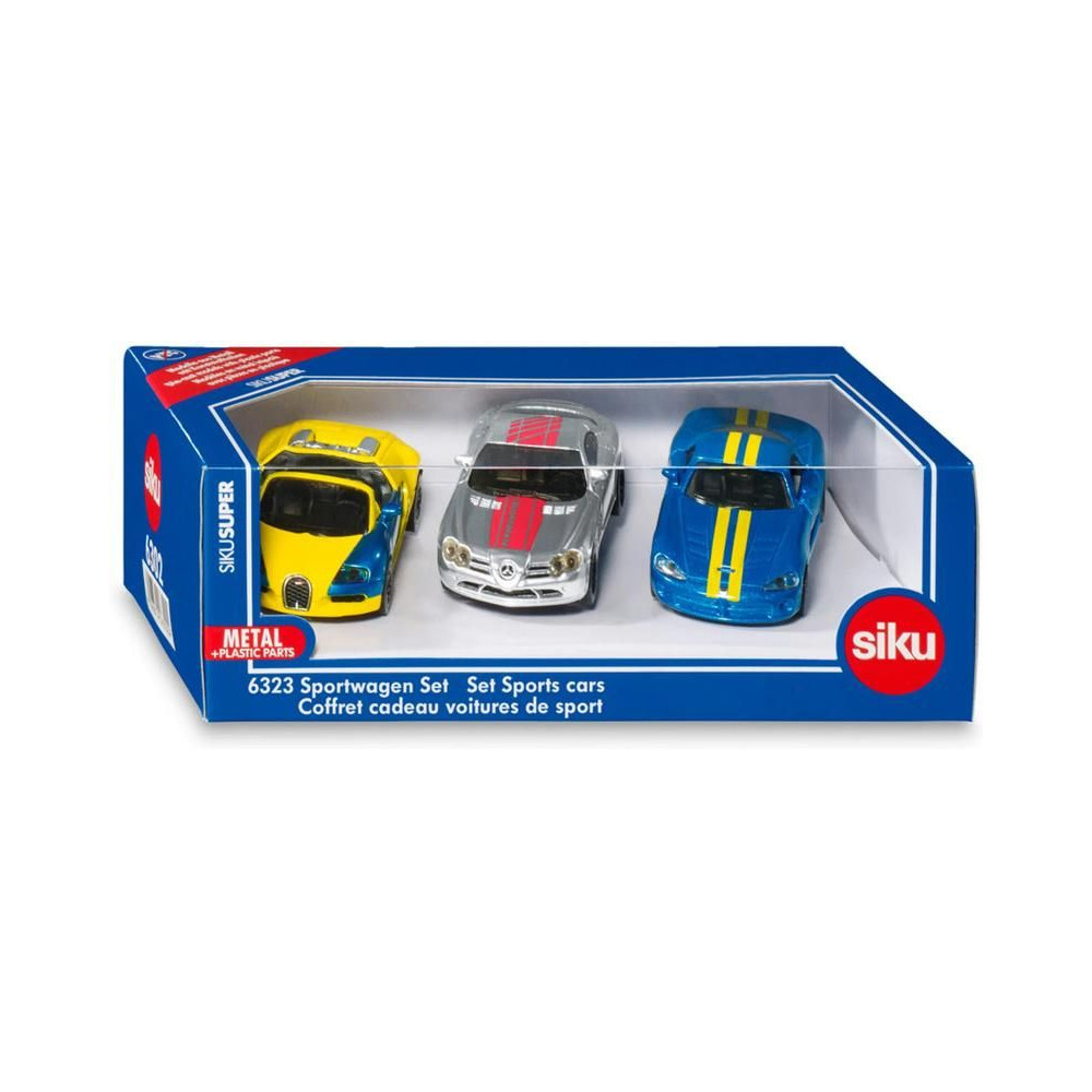 Siku márkájú Bugatti Veyron, Mercedes-Benz McLaren SLS és Dodge Viper autók fémmodelljeiből álló készlet. A modellek átlátszó ablakokkal, kidolgozott belső térrel rendelkeznek, a Dodge Viper modell ajtói pedig nyithatók. Játékra és gyűjtésre egyaránt alkalmas. Minőségi fém- és műanyag kidolgozás.