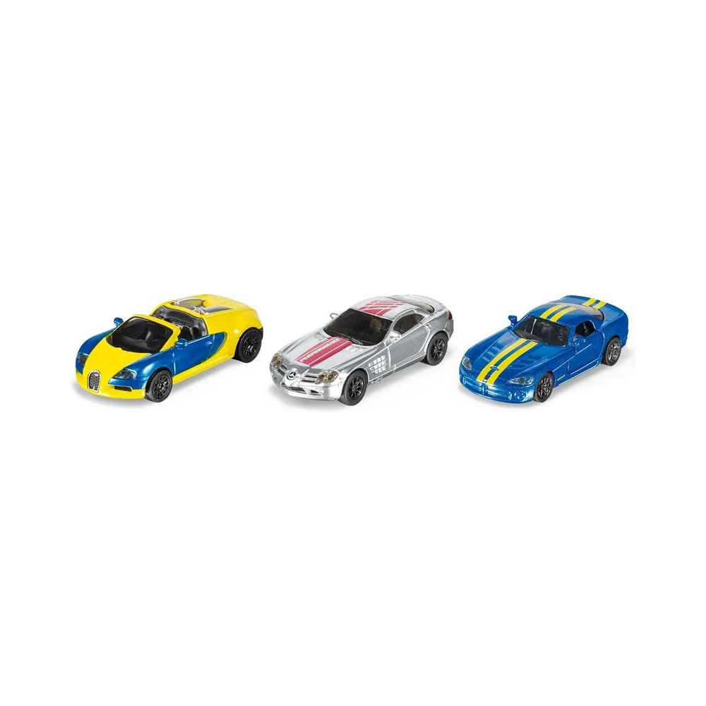 Siku márkájú Bugatti Veyron, Mercedes-Benz McLaren SLS és Dodge Viper autók fémmodelljeiből álló készlet. A modellek átlátszó ablakokkal, kifinomult belsővel rendelkeznek, a Dodge Viper modell ajtói pedig nyithatók. Játékra és gyűjtésre egyaránt alkalmas. Minőségi fém- és műanyag kidolgozás.