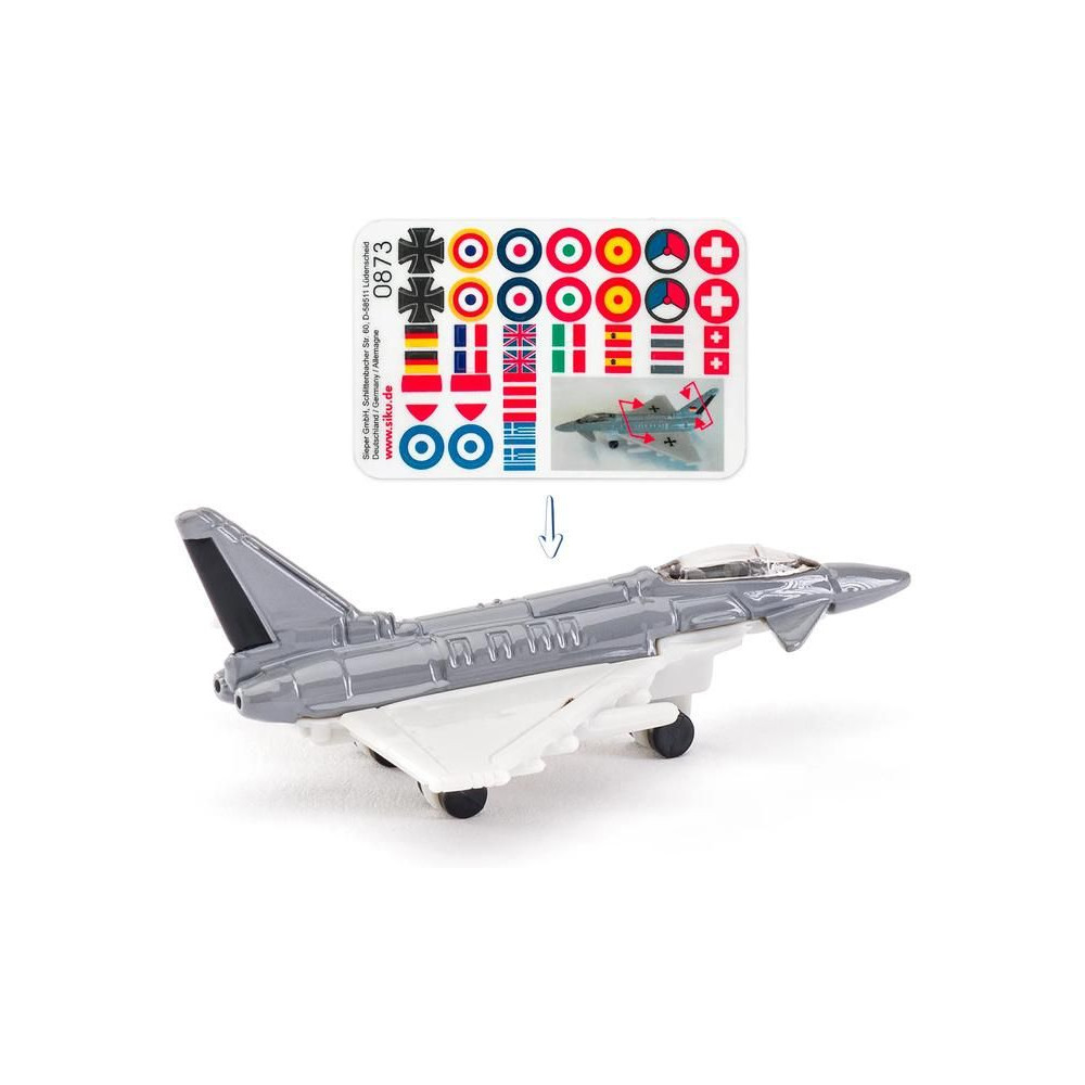 Siku márkájú katonai vadászgép fémmodellje. A vadászgép matricákkal van ellátva, amelyekkel egyedi dizájnt alkothatsz. Játékra és gyűjtésre egyaránt alkalmas. Minőségi fém és műanyag kidolgozás. Bliszterben csomagolva.