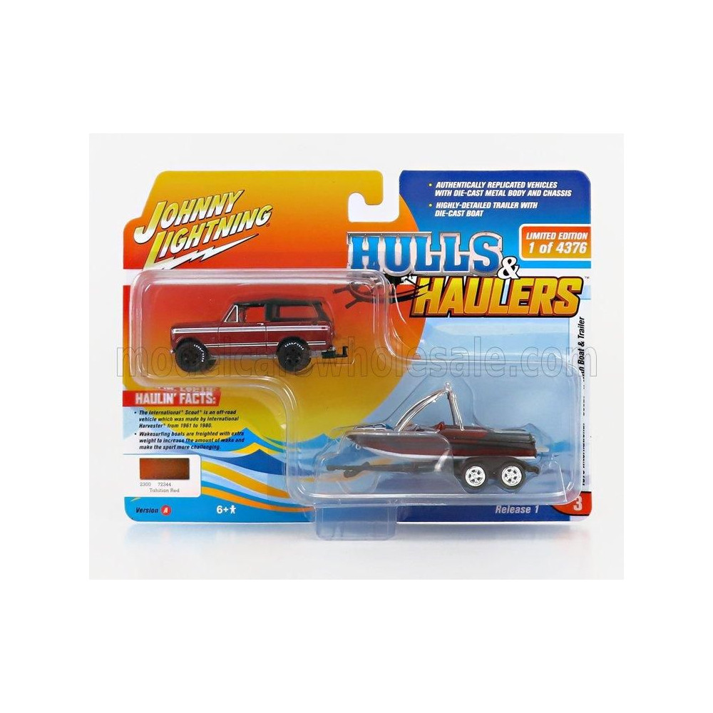 JOHNNY LIGHTNING NEMZETKÖZI CSERKÉSZ UTÁNFUTÓVAL ÉS CSÓNAKKAL 1979 - PIROS FEKETE 1/64