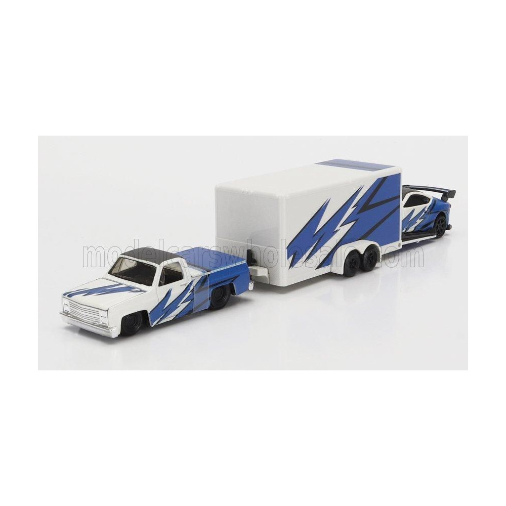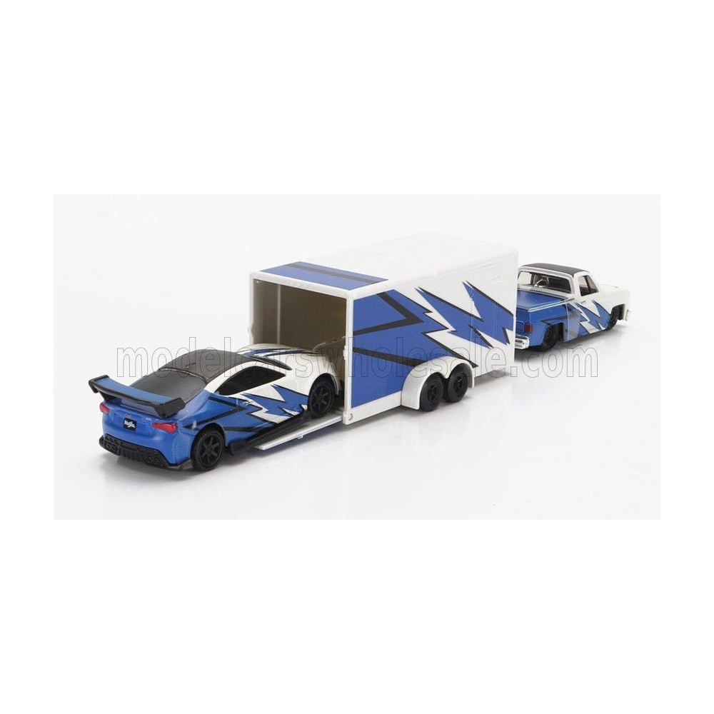 ÉLELMISZER CHEVROLET 1500 PICK-UP PÓTKOCSIVAL AUTÓSZÁLLÍTÓ + SUBARU BRX 2019 - KÉK FEHÉR 1/64