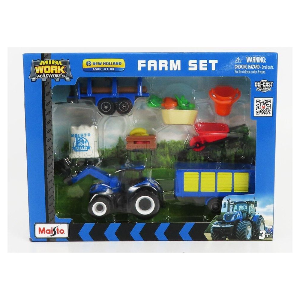 ÉLELMISZER NEW HOLLAND FARM SZETT T7-315 TRAKTOR TARTOZÉKOKKAL 2018 - KÉK SÁRGA 1/64