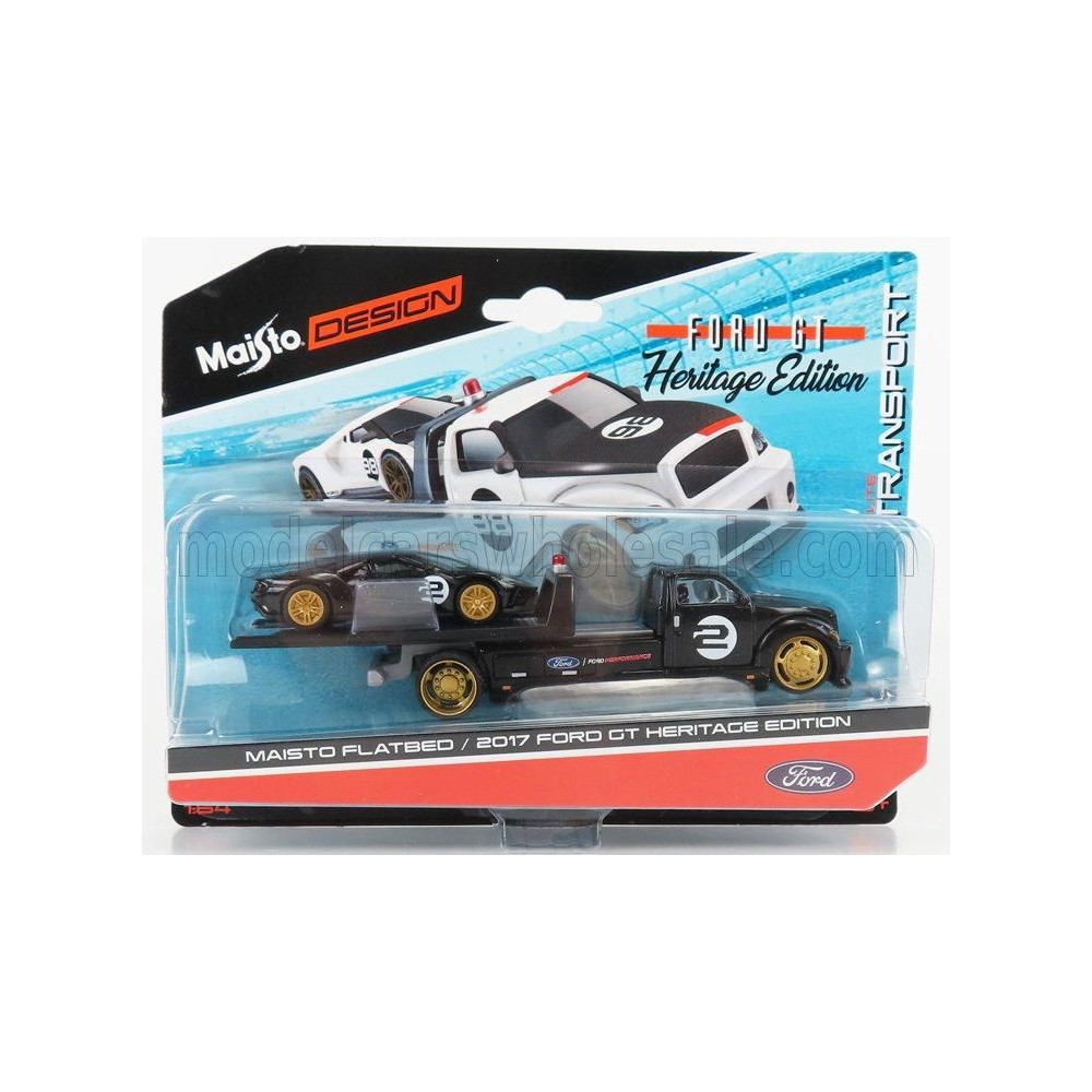 A MAISTO FORD USA RAMP TRUCK WRECKER WITH FORD GT N 2 HERITAGE EDITION 2017 egy lenyűgöző mini méretarányú modellautó, mely fekete színben pompázik. Ez a szép kisautó ideális választás minden járműgyűjtő számára, aki szereti az autósport legendás pillanatait a modelljein.