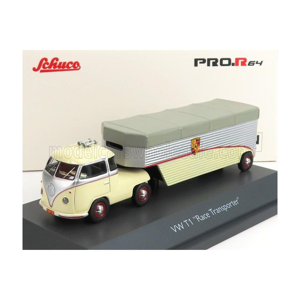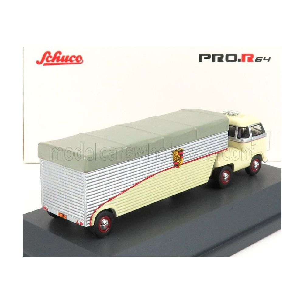 SCHUCO VOLKSWAGEN T1b CONTINENTAL MOTORS PORSCHE CAR TRANSPORTER 1962 - CREAM GREY SILVER 1/64