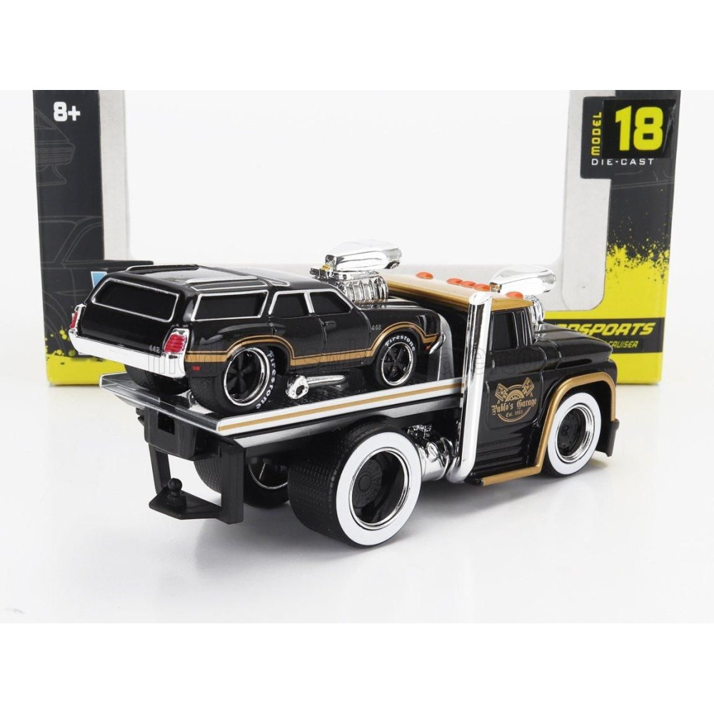 MAISTO CHEVROLET C-60 PLATTÓS AUTÓSZÁLLÍTÓ 1966 OLDSMOBILE VISTA CRUISER CUSTOM 1970-ES SZÁLLÍTÁSSAL - FEKETE ARANY 1/64