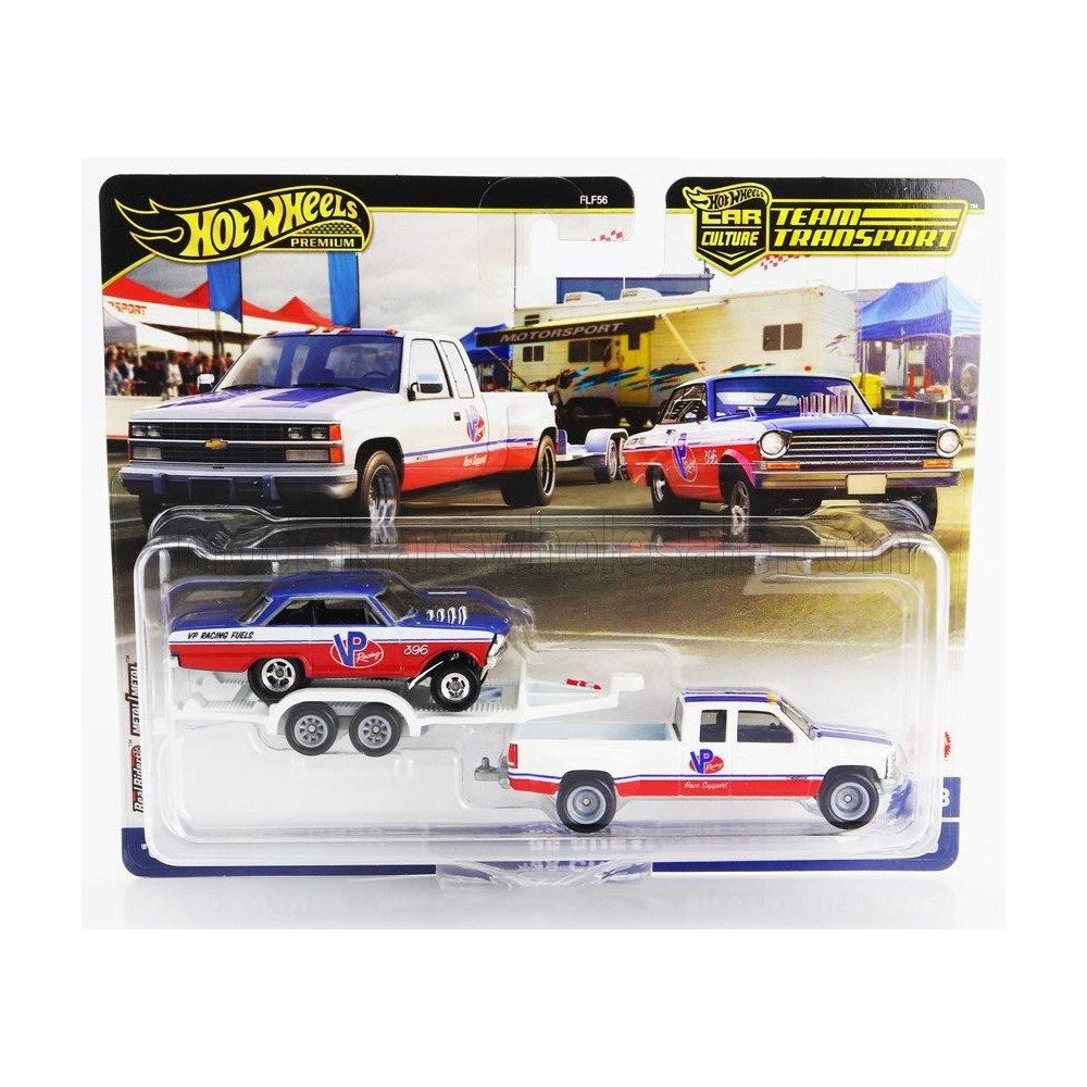 MATTEL HOT WHEELS CHEVROLET SILVERADO 3500 PICK-UP PÓTKOCSIKOS AUTÓSZÁLLÍTÓVAL + CHEVROLET NOVA 1963 - FEHÉR PIROS KÉK 1/64